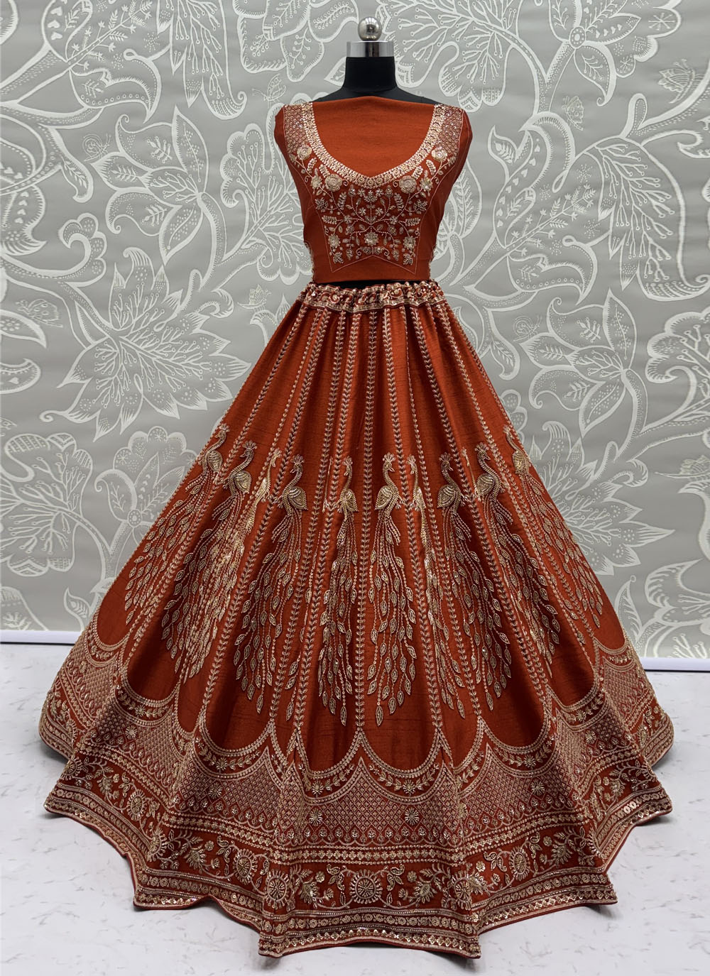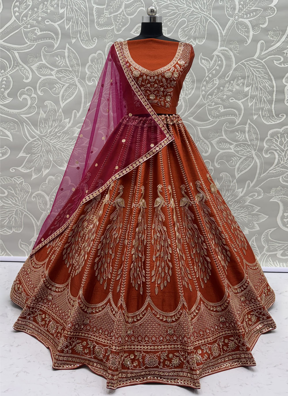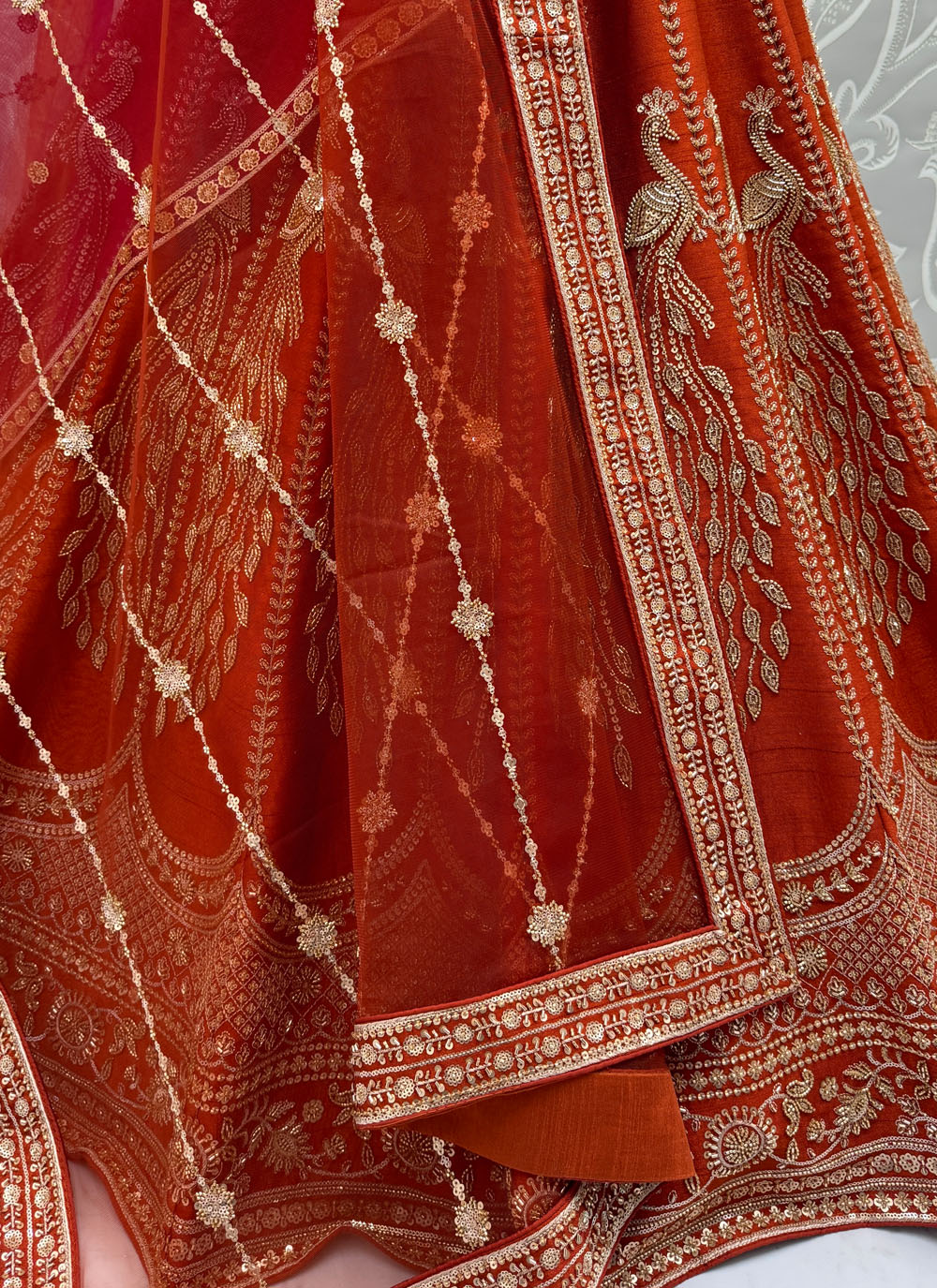 This Orange Silk Wedding Lehenga Choli showcases beautiful dori and zari patterns enhanced with crystal accents. The elegant design offers a sophisticated traditional look suitable for grand occasions. Comes with matching choli and dupatta.