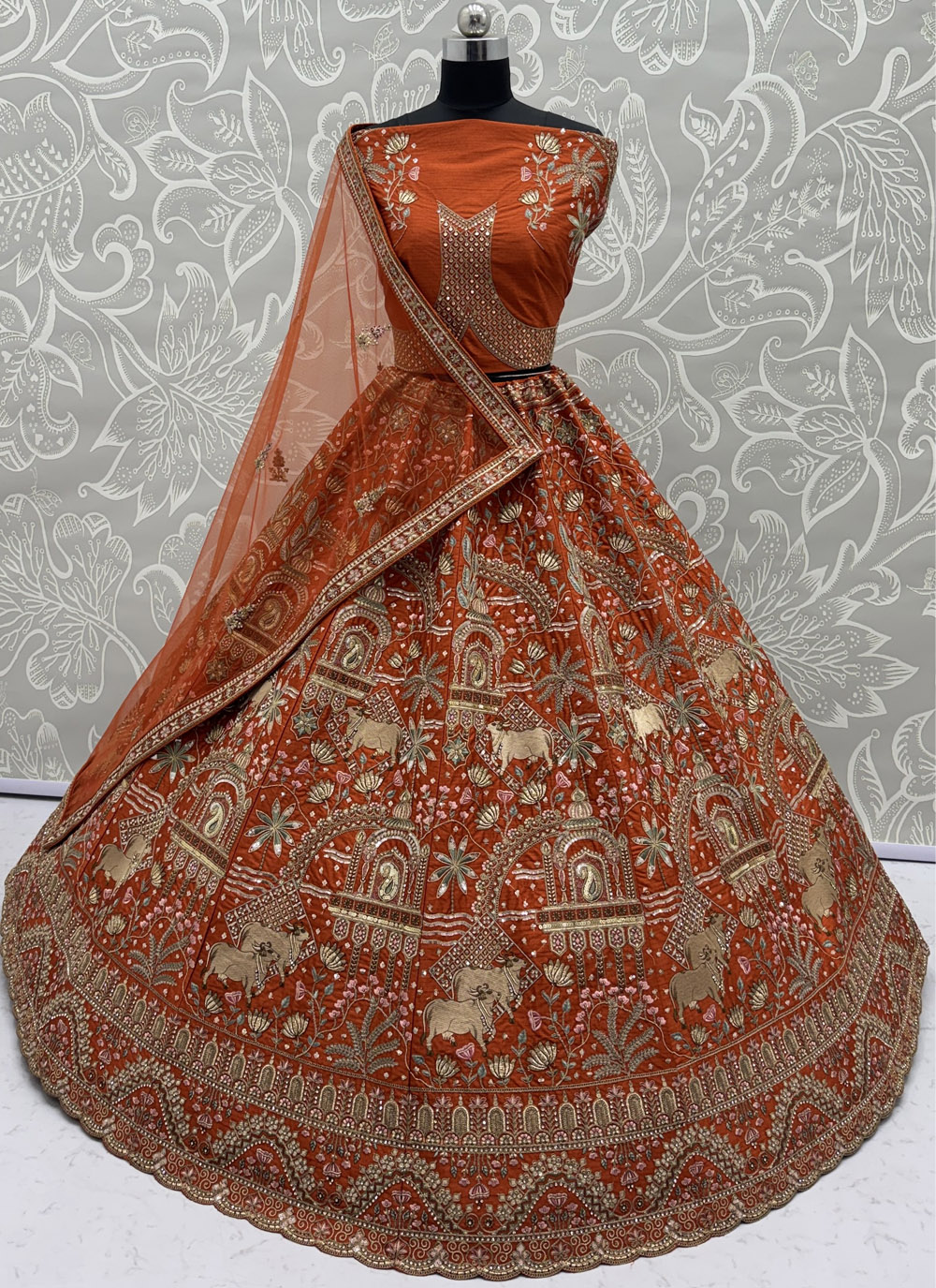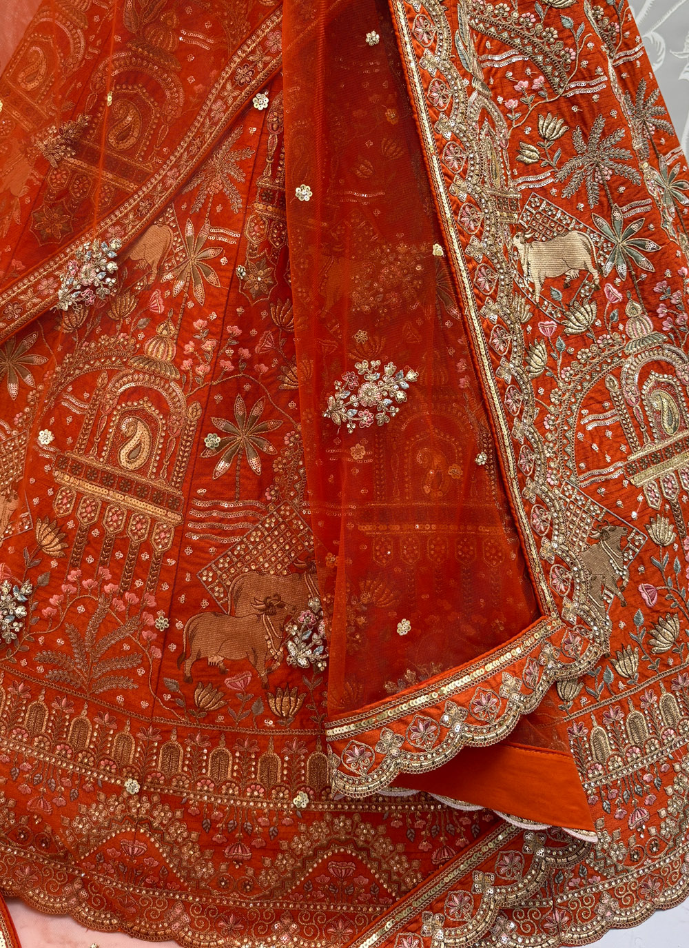 Celebrate timeless tradition with this beautifully designed Orange Silk Embroidered Wedding Lehenga Choli. The rich silk fabric offers a smooth and graceful drape, while the intricate sequins, zari, thread, and dori embroidery enhance its designer appeal. Comes with matching choli and dupatta.
