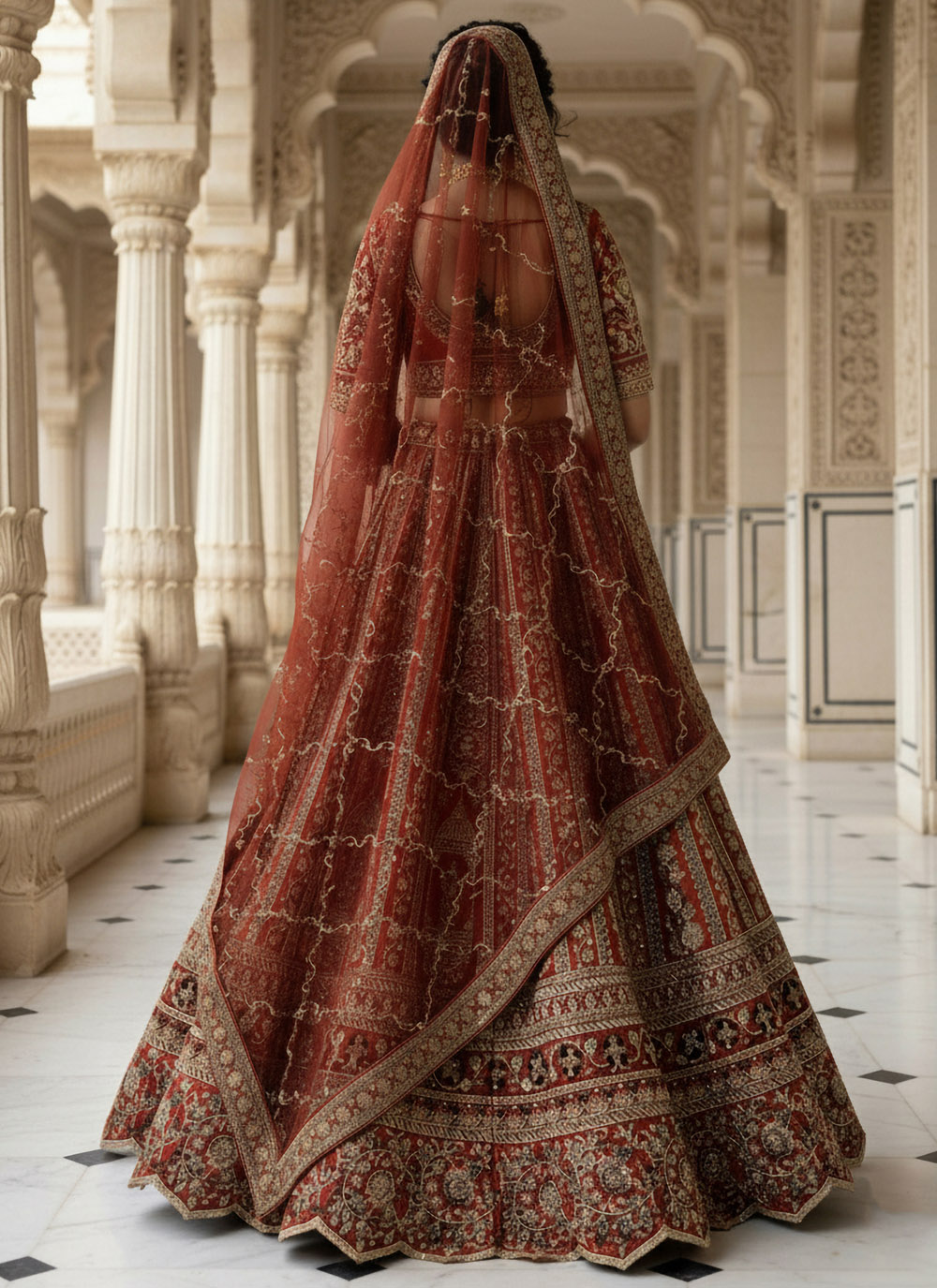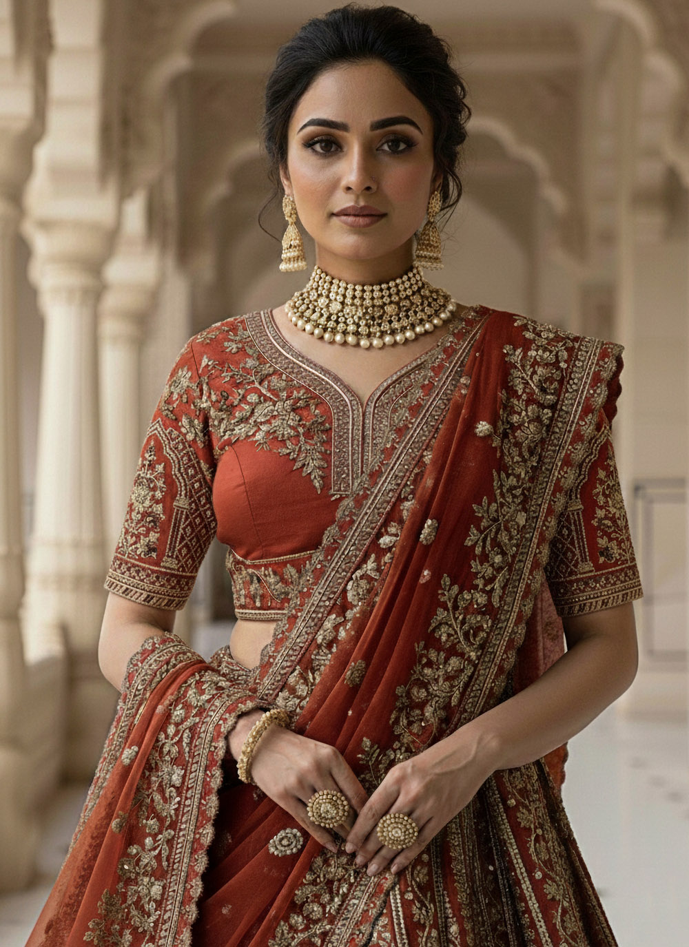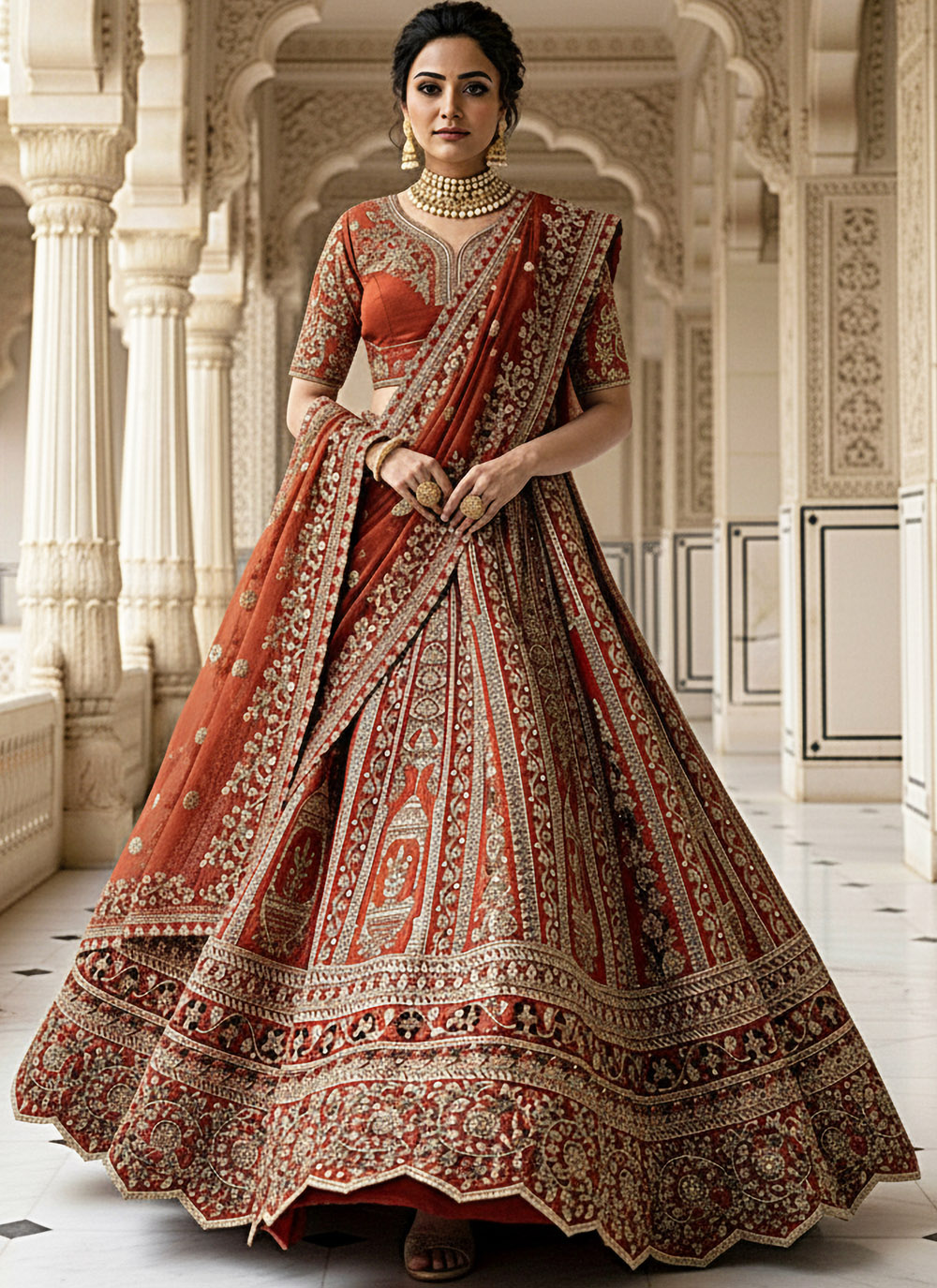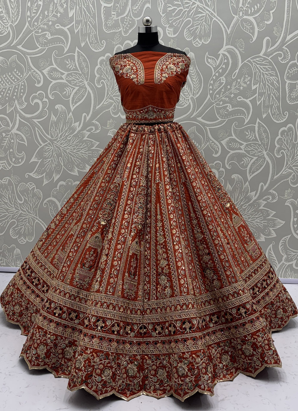 This wedding lehenga choli features hand-crafted embroidery with dori, multi-thread, and zari work, complemented by sequins and diamond studs throughout. Its vibrant orange hue ensures you stand out as the center of attention in every wedding function. Comes with matching choli and dupatta.