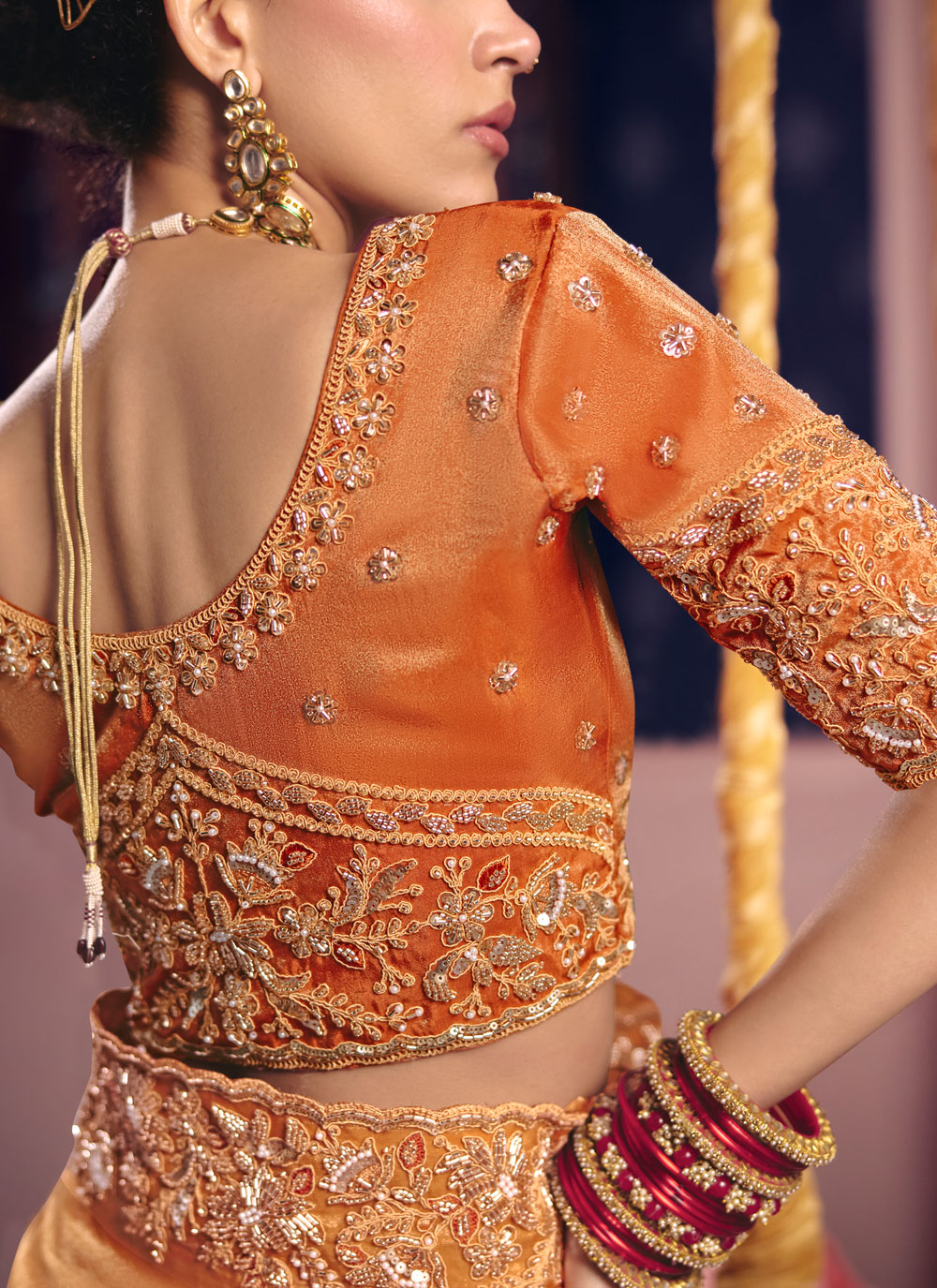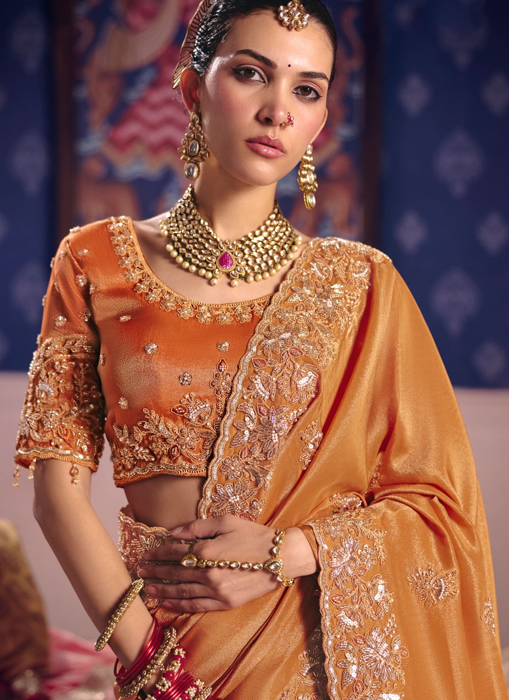 Orange Viscose Tissue Silk Beads Embroidered Saree for Reception reflects vibrant elegance with its radiant hue and refined craftsmanship. The shimmering texture of viscose tissue silk combined with delicate bead embroidery creates a graceful ensemble. Comes with matching blouse.