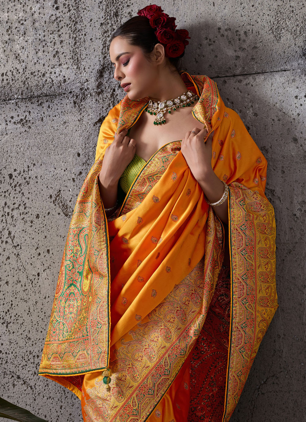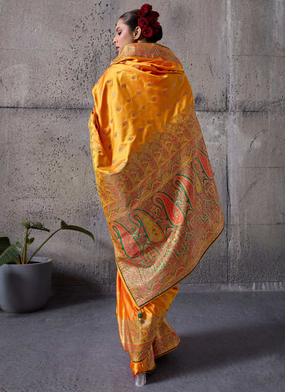 Crafted for modern women who cherish tradition, this orange zari meenakari woven saree blends heritage craftsmanship with a contemporary silhouette. The glossy satin silk fabric enhances the richness of the woven patterns. Comes with matching blouse.