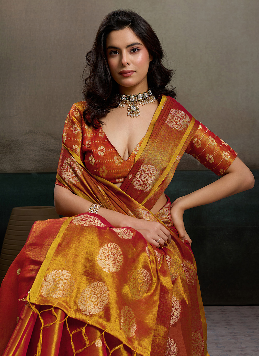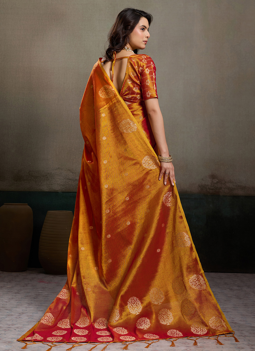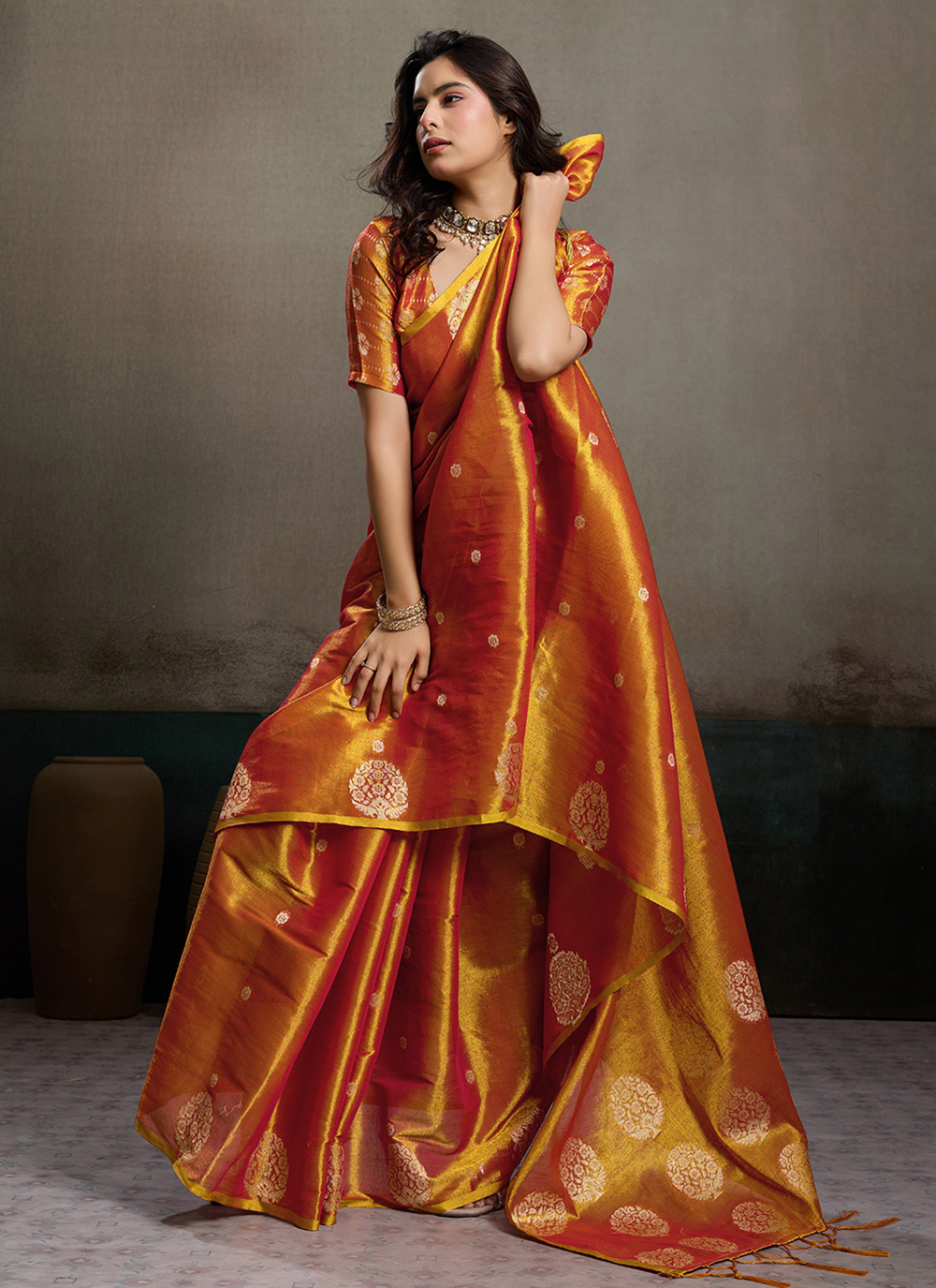 This Orange Woven Tissue Silk Contemporary Saree highlights artistic weaving with a radiant color palette. The delicate texture of tissue silk combined with sophisticated woven detailing adds charm and elegance suitable for festive and cultural occasions. Comes with matching blouse.