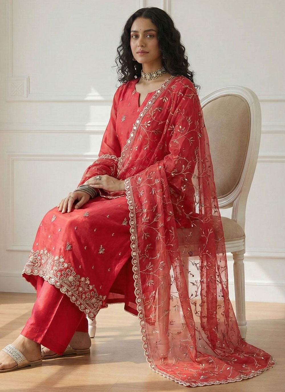 This Designer Red Organza Salwar Kameez is beautifully crafted with elegant embroidery that enhances its rich festive appeal. The lightweight organza fabric combined with the bold red shade creates a striking ethnic look for special occasions. Comes with matching bottom and dupatta.