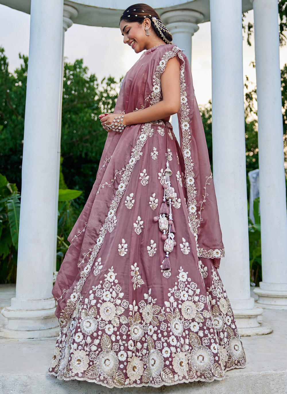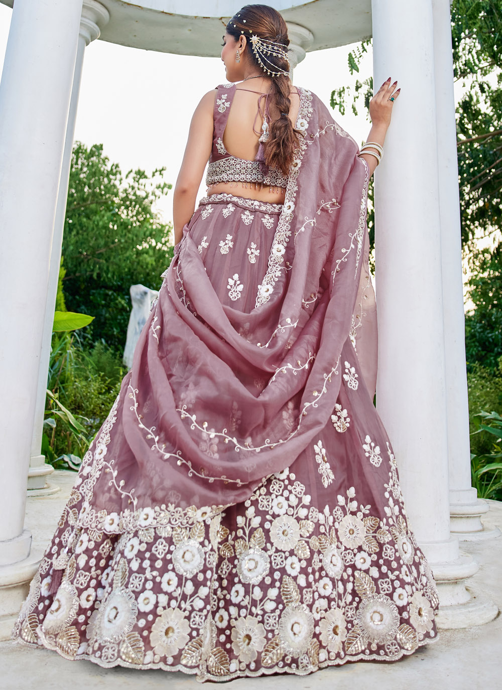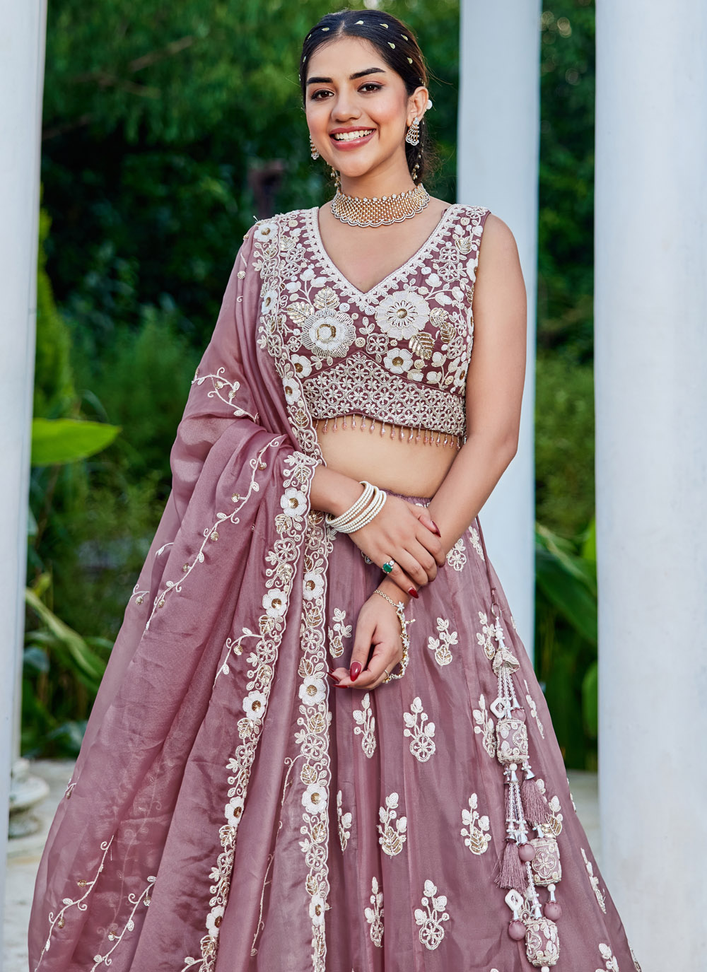 This lavender embroidered organza lehenga choli is a perfect sangeet outfit, featuring delicate thread work, shimmering sequins, and cutdana highlights. The readymade fit offers comfort with effortless elegance. Comes with matching choli and dupatta.