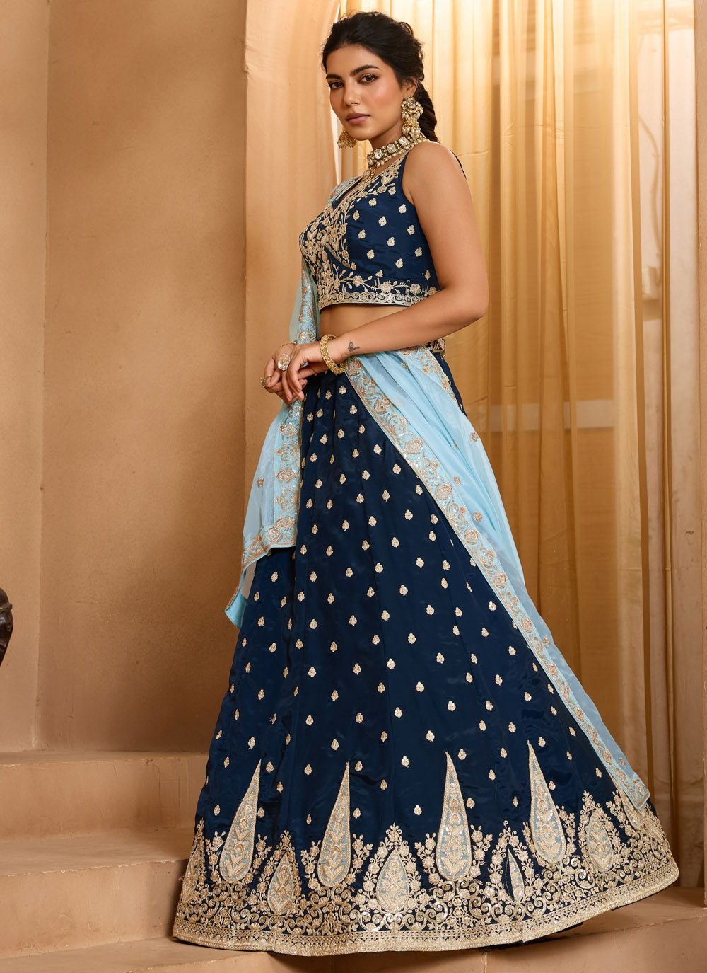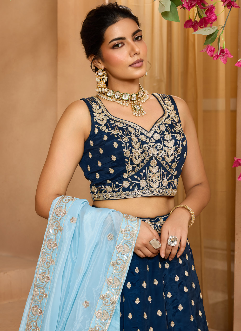 This designer organza lehenga choli in navy blue captures the perfect blend of tradition and elegance. Adorned with intricate sequins embroidery, it brings a refined shimmer to your ceremonial look. Comes with matching choli and dupatta.