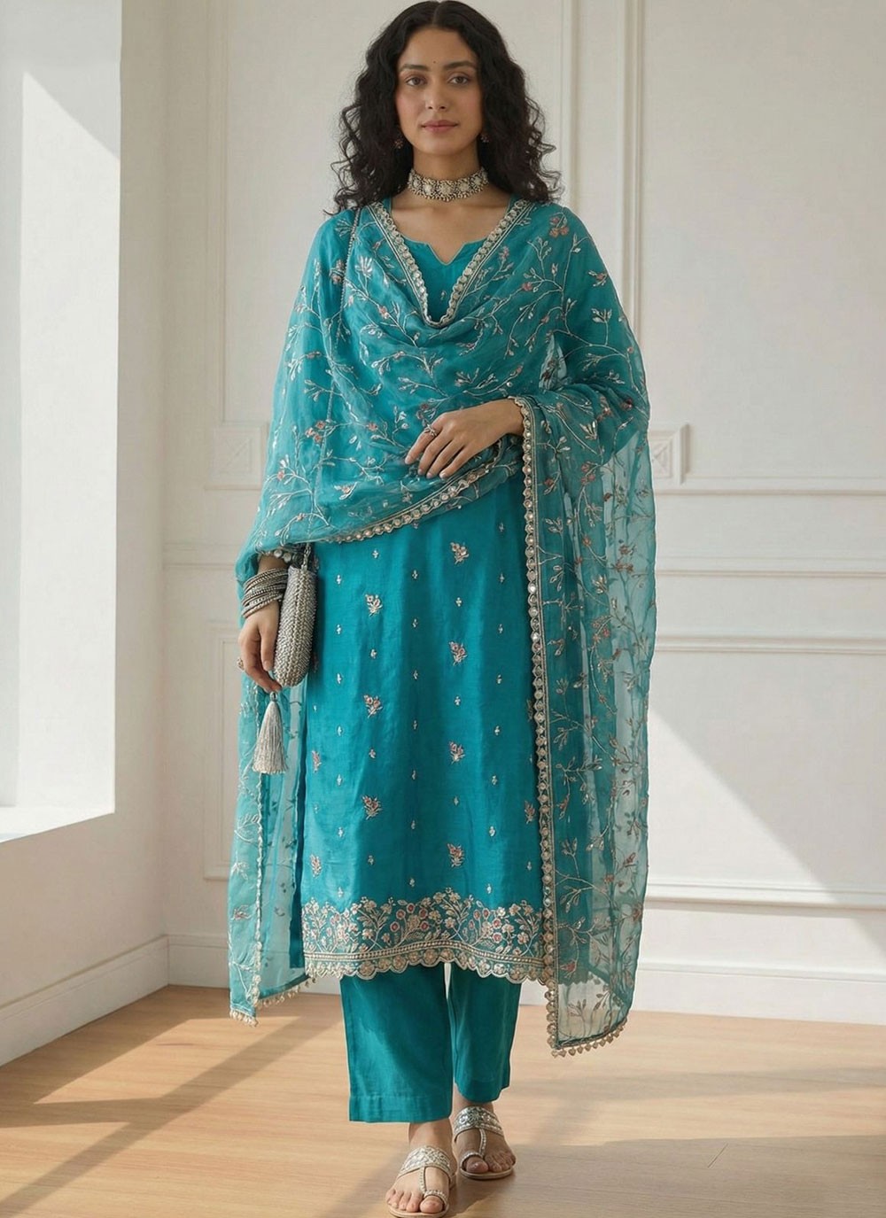 This Sea Green Organza Readymade Pant Style Salwar Suit features elegant embroidery that adds a refined and graceful look. The soft organza fabric paired with the refreshing sea green shade makes it a perfect choice for festive and special occasions. Comes with matching bottom and dupatta.