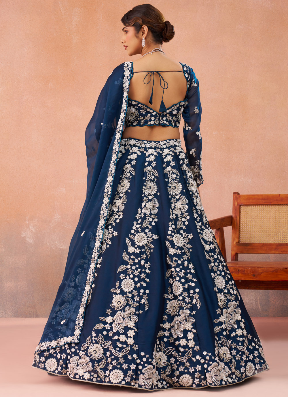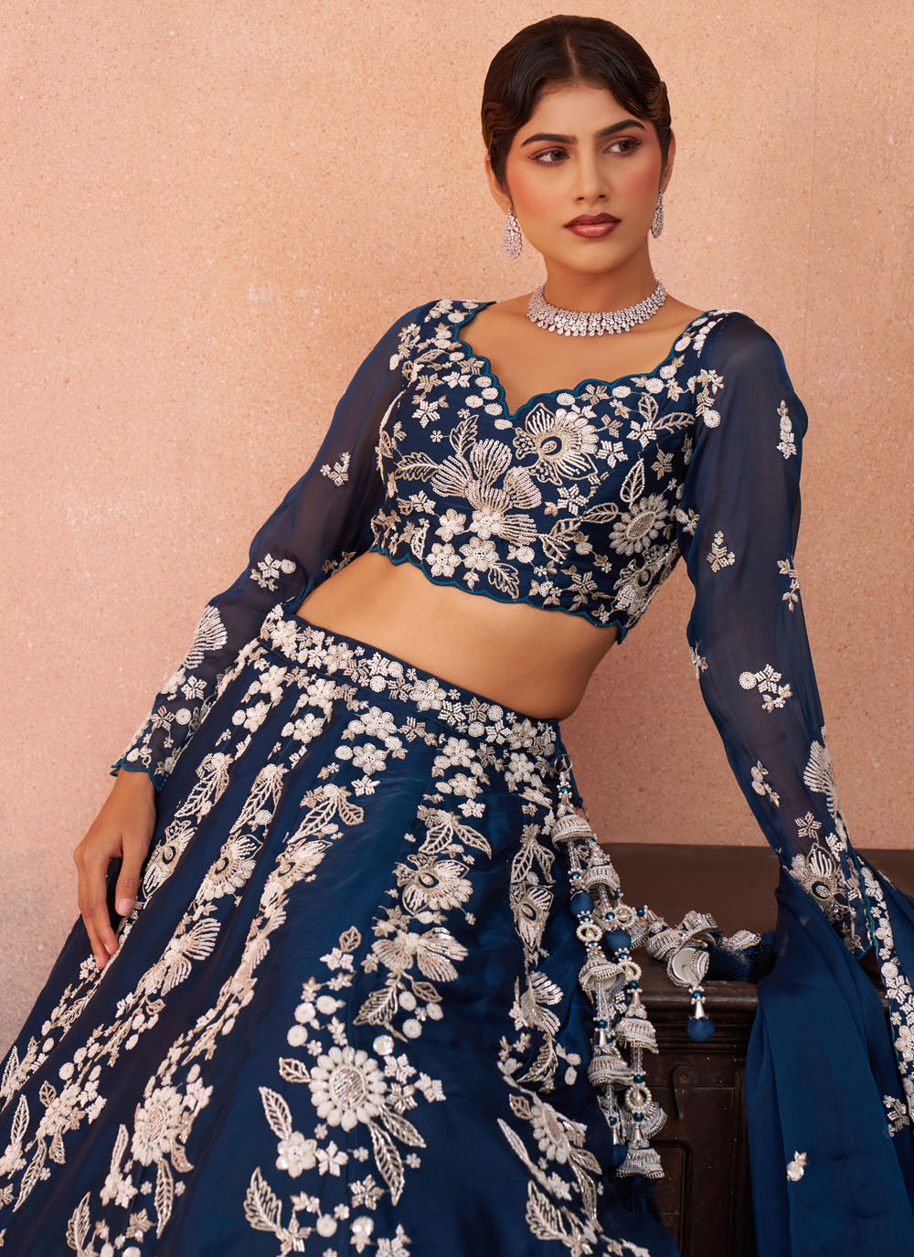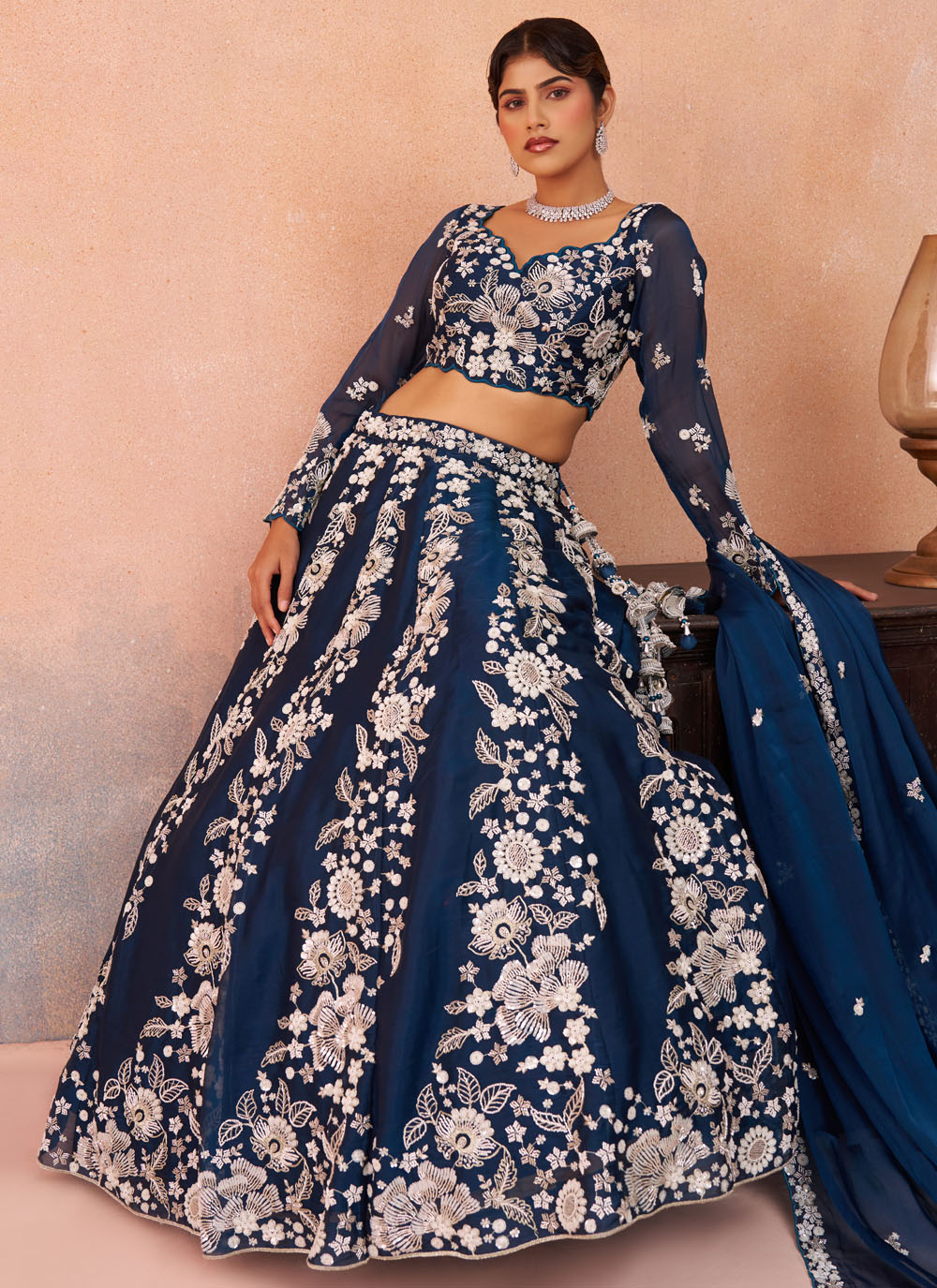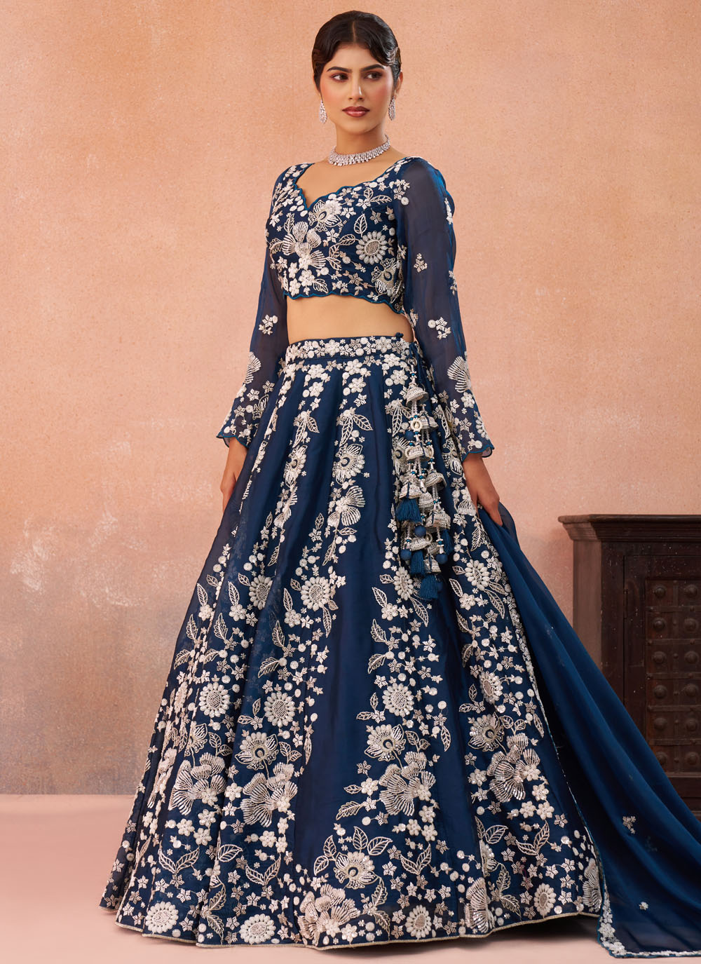 Graceful and fashionable, this blue lehenga choli features intricate sequins and beads embroidery that highlights its refined craftsmanship. The soft organza texture and elegant colour create a sophisticated ethnic outfit. Comes with matching choli and dupatta.