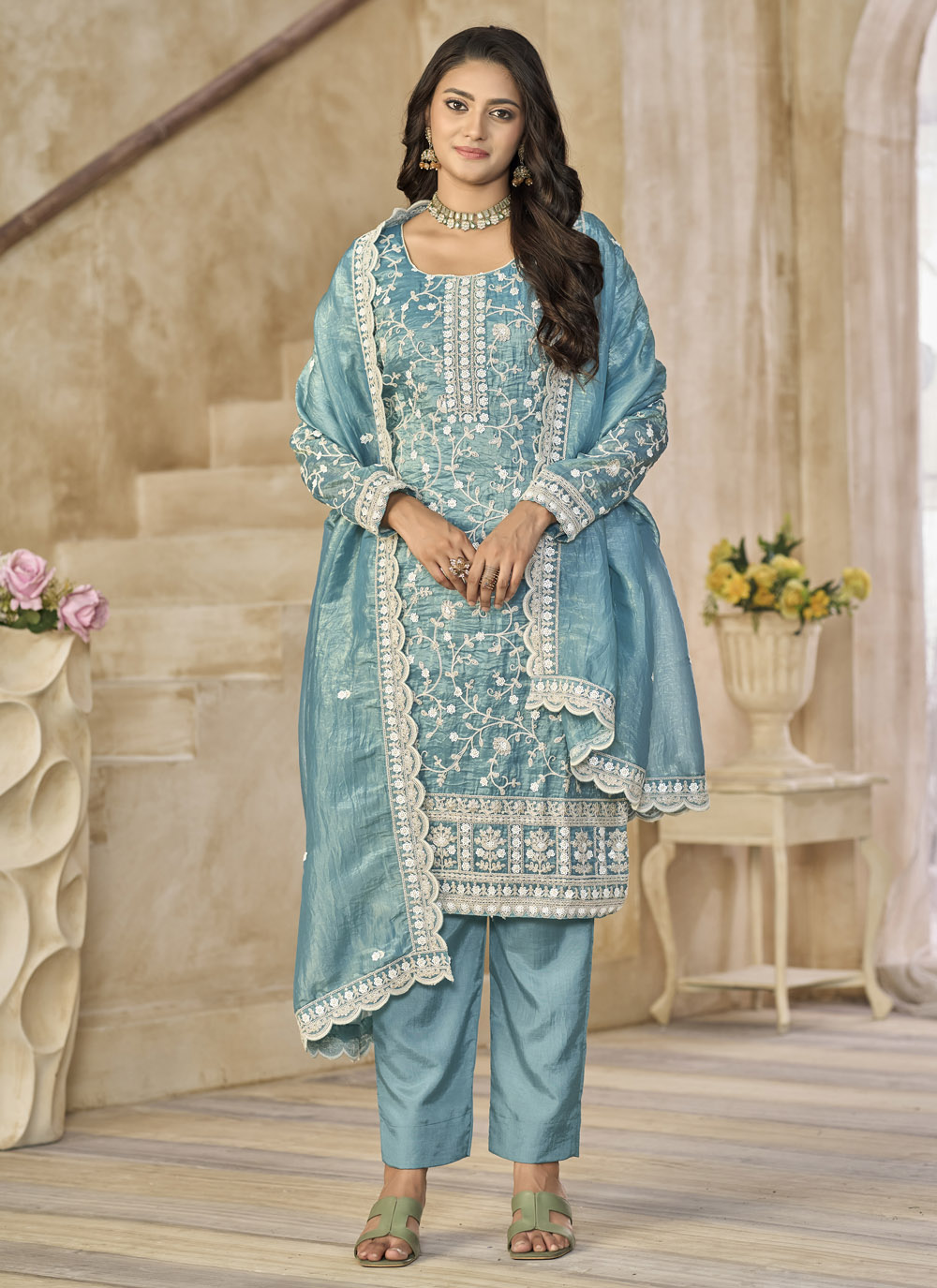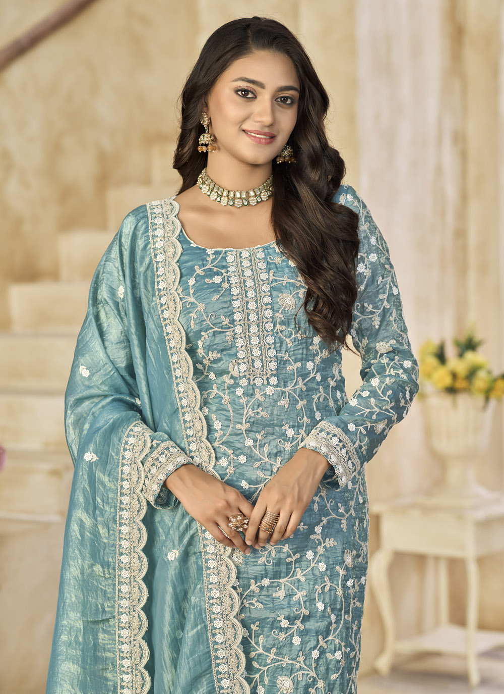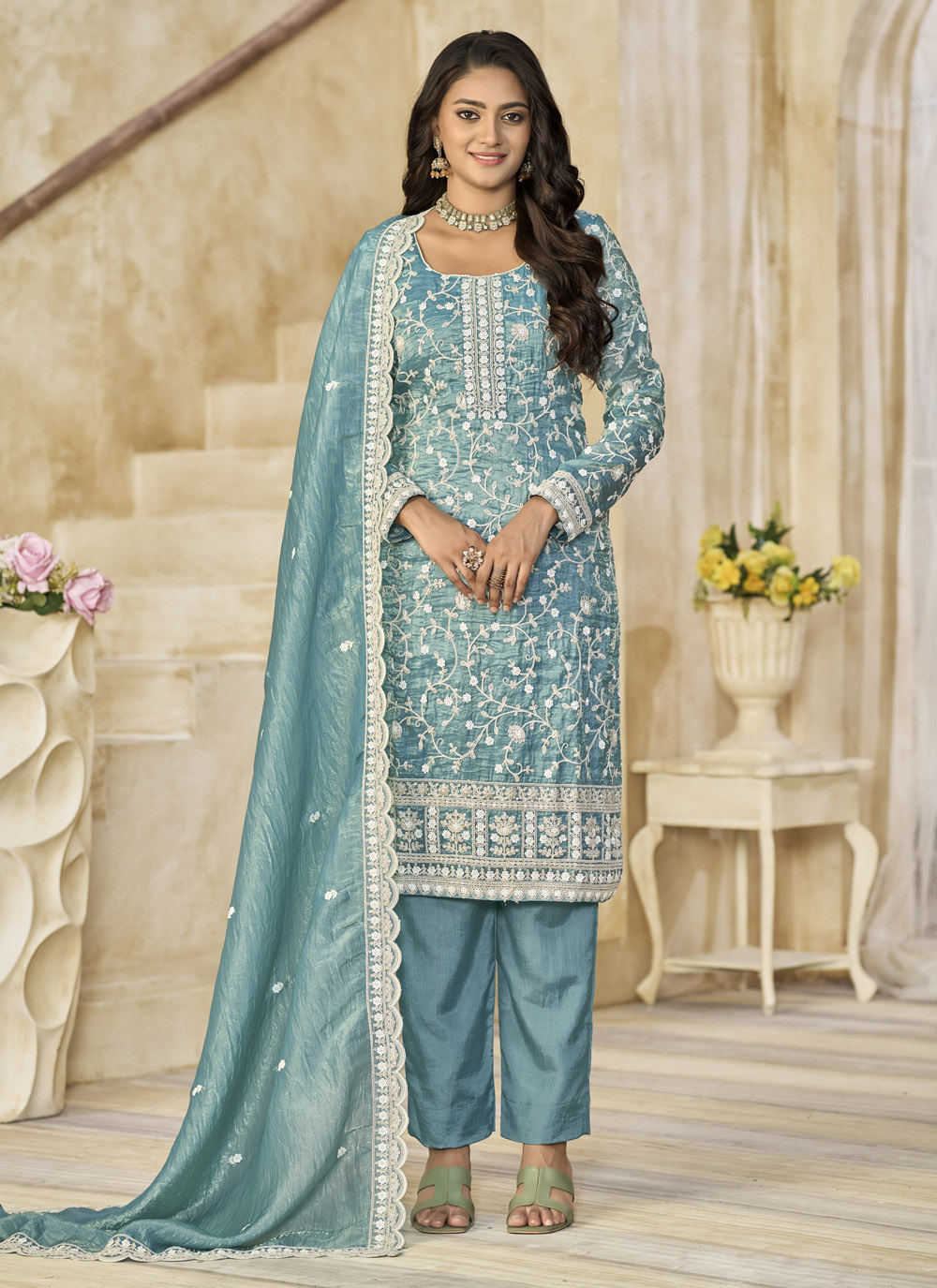 Step into contemporary elegance in this Firozi Organza Salwar Kameez crafted with shimmering sequins that catch the light with every movement. The trendy silhouette pairs classic charm with a fashionable twist, making it ideal for parties, festive events, and special occasions. Comes with matching bottom and dupatta.