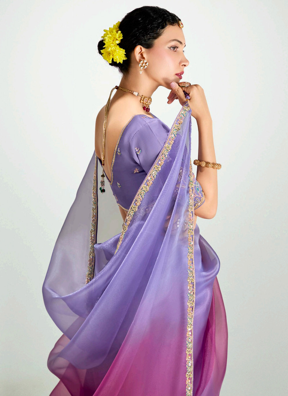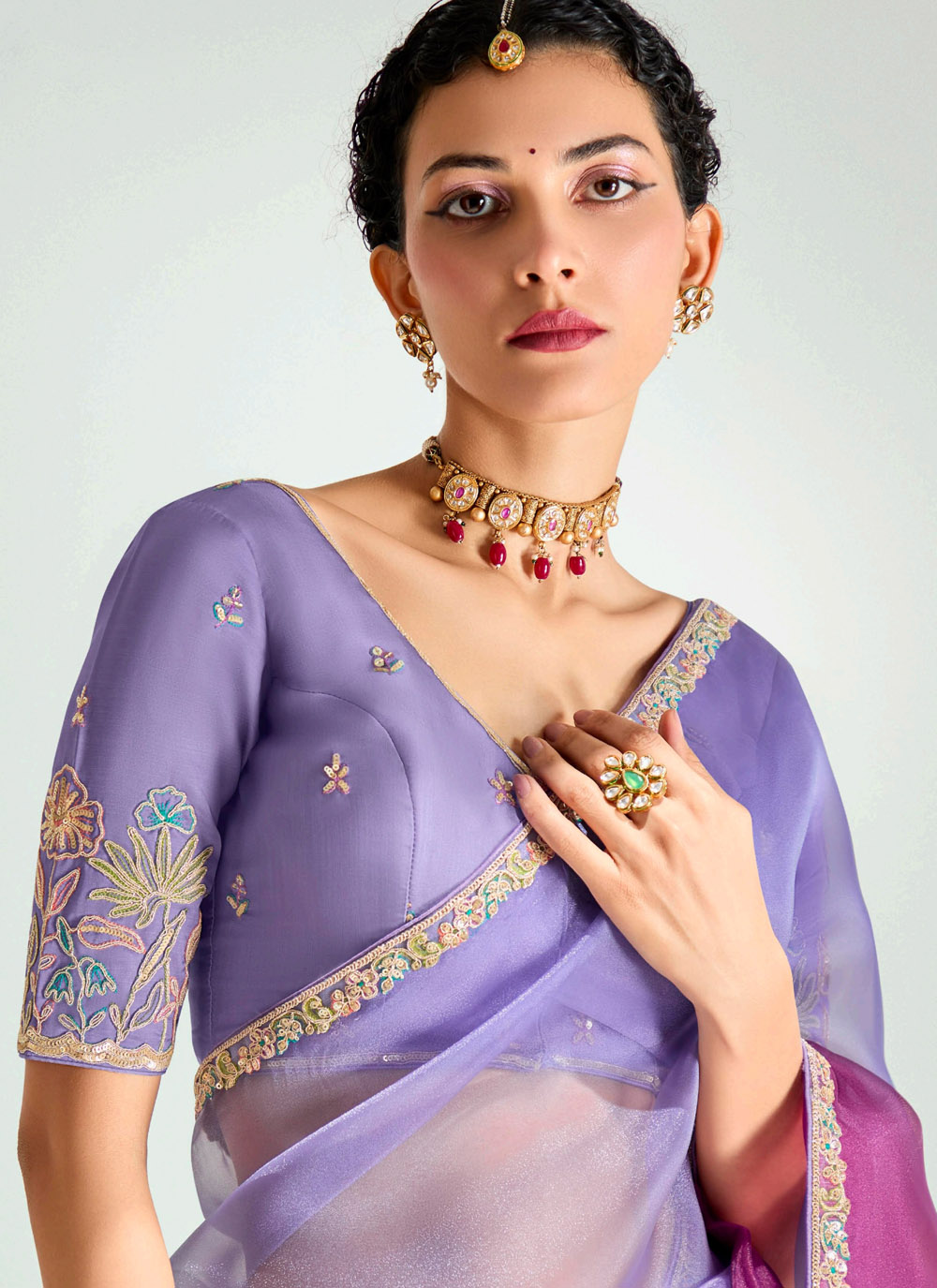This contemporary lavender saree in soft tissue organza fabric features elegant zari embroidered borders that add a refined touch. The breezy texture and pastel shade create a graceful look. perfect for cultural events, engagements and designer occasions. Comes with matching blouse.