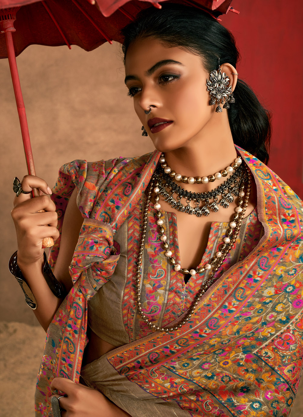 Crafted from premium pashmina cotton, this saree blends simplicity with elegance. The subtle weaving design enhances the classic brown shade, offering a sophisticated ethnic look. Comes with matching blouse.
