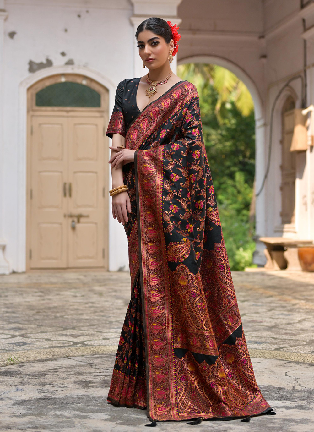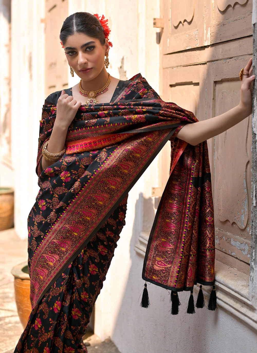 Elevate your traditional wardrobe with the Pashmina Silk Black Printed Saree. This stunning saree, made from luxurious Pashmina silk, features intricate prints and is paired with a matching blouse, ideal for formal events, weddings, and celebrations.