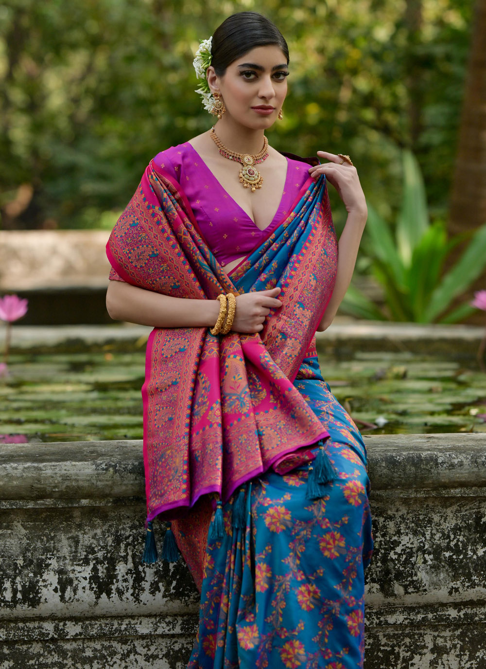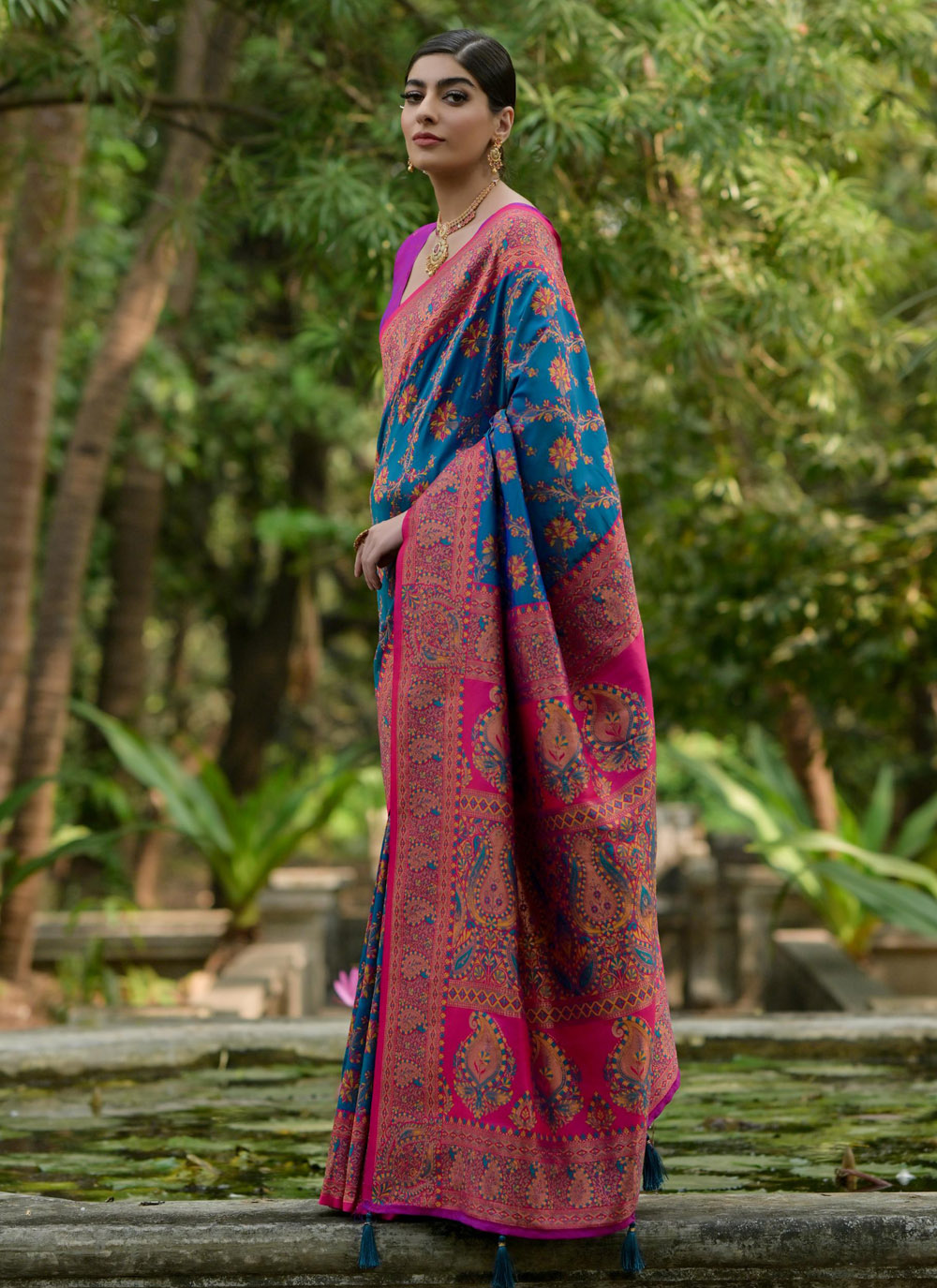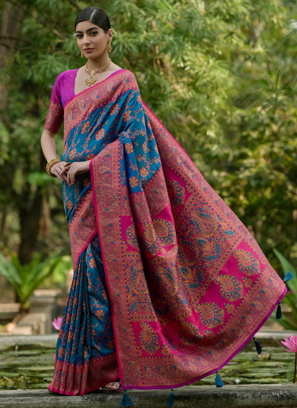 This Pashmina Silk Firozi Meenakari Woven Saree is where heritage meets contemporary style. The rich firozi color complements the intricate Meenakari work, creating a perfect fusion of traditional craftsmanship and modern appeal. Ideal for weddings, festivals, or intimate gatherings Comes with matching blouse.