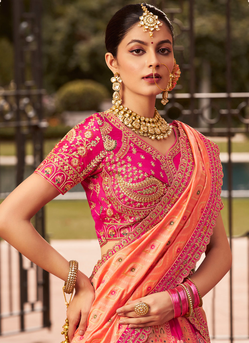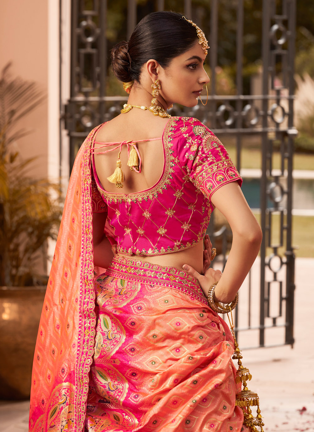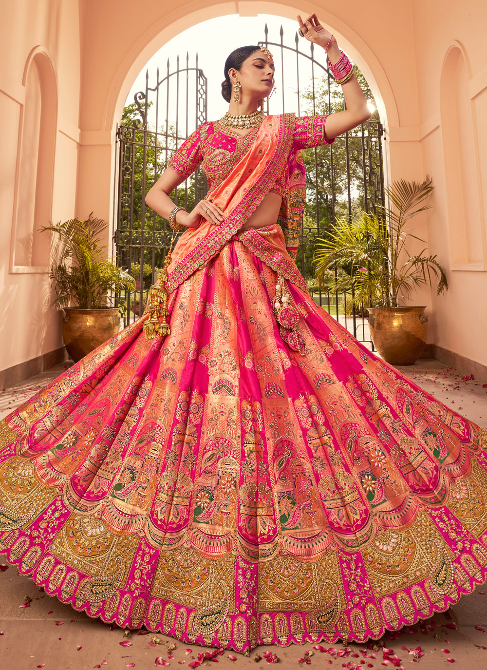 Celebrate your special day with timeless grace in this peach and pink bridal lehenga choli crafted from opulent Banarasi silk. Rich in tradition, the ensemble features expert embroidery, delicate thread and zari detailing, glimmering sequins, and elegant stone work. Its impeccable craftsmanship and ethereal flow make it a heritage-inspired choice for any modern bride. Comes with matching choli and dupatta.