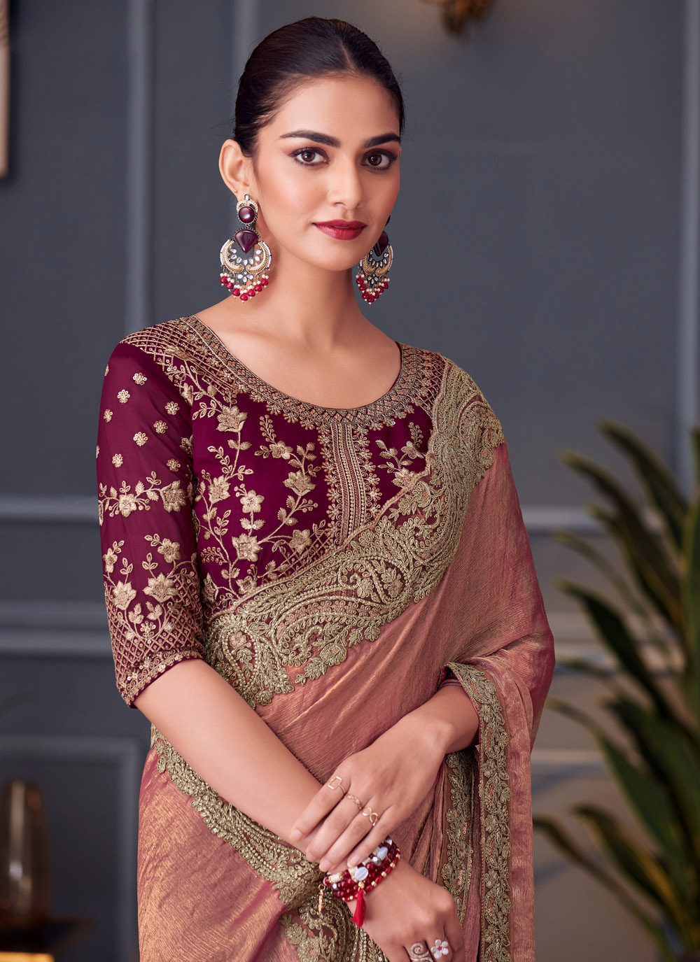 Crafted from premium silk, this peach and pink saree brings together the richness of zari embroidery and the finesse of cutwork detailing. The graceful border adds a regal touch—perfect for traditional functions and bridal celebrations. Comes with matching blouse.
