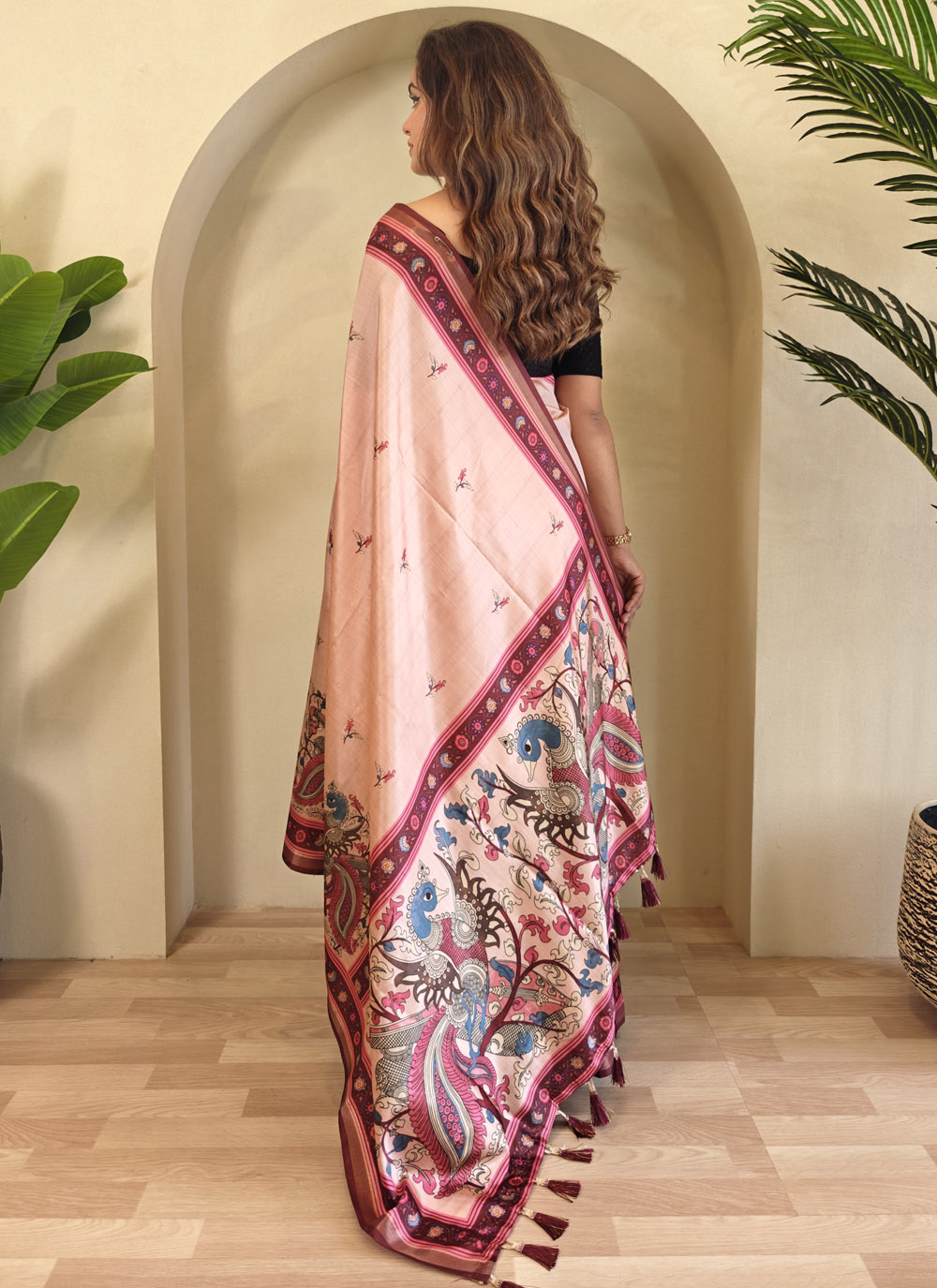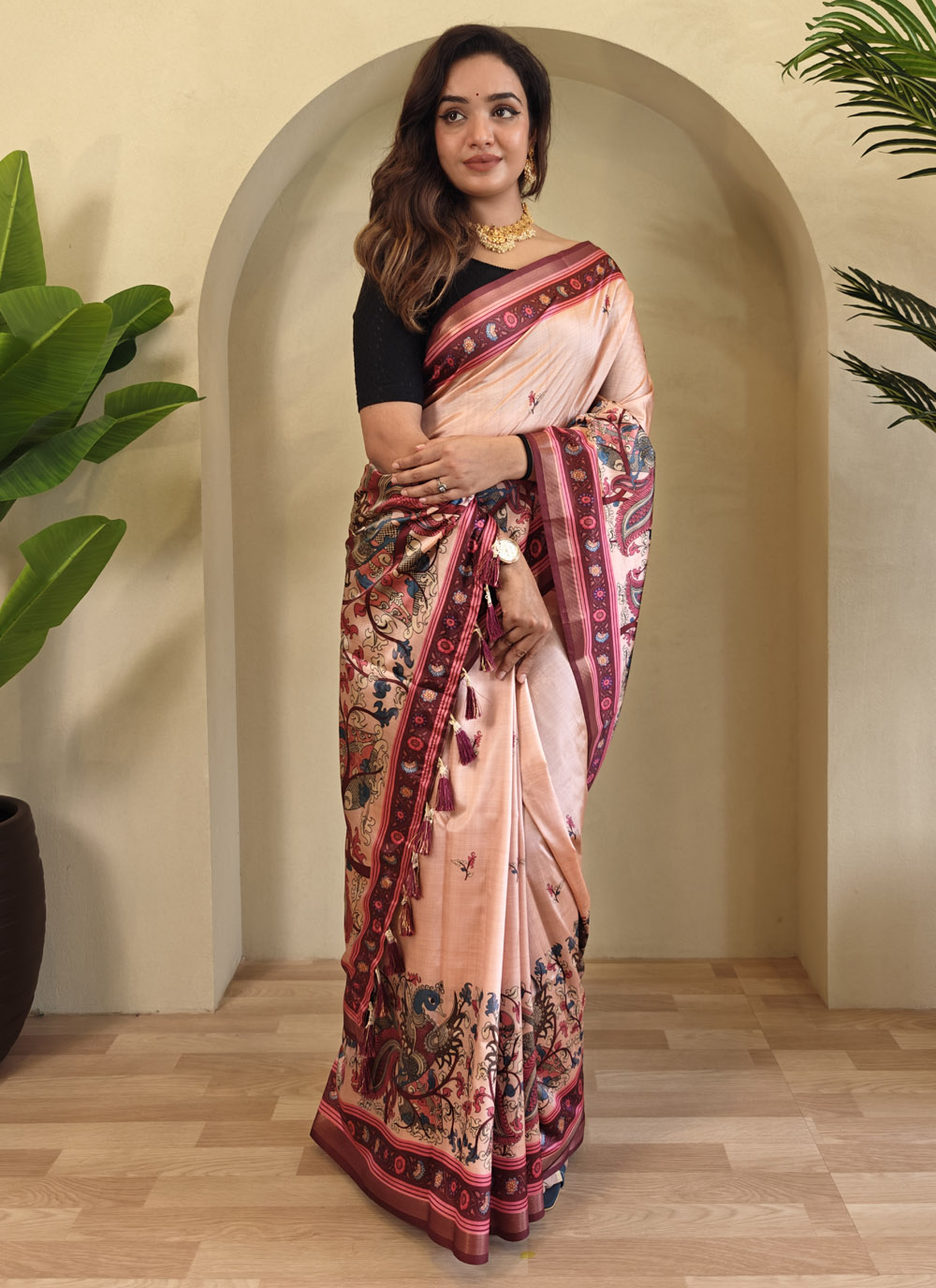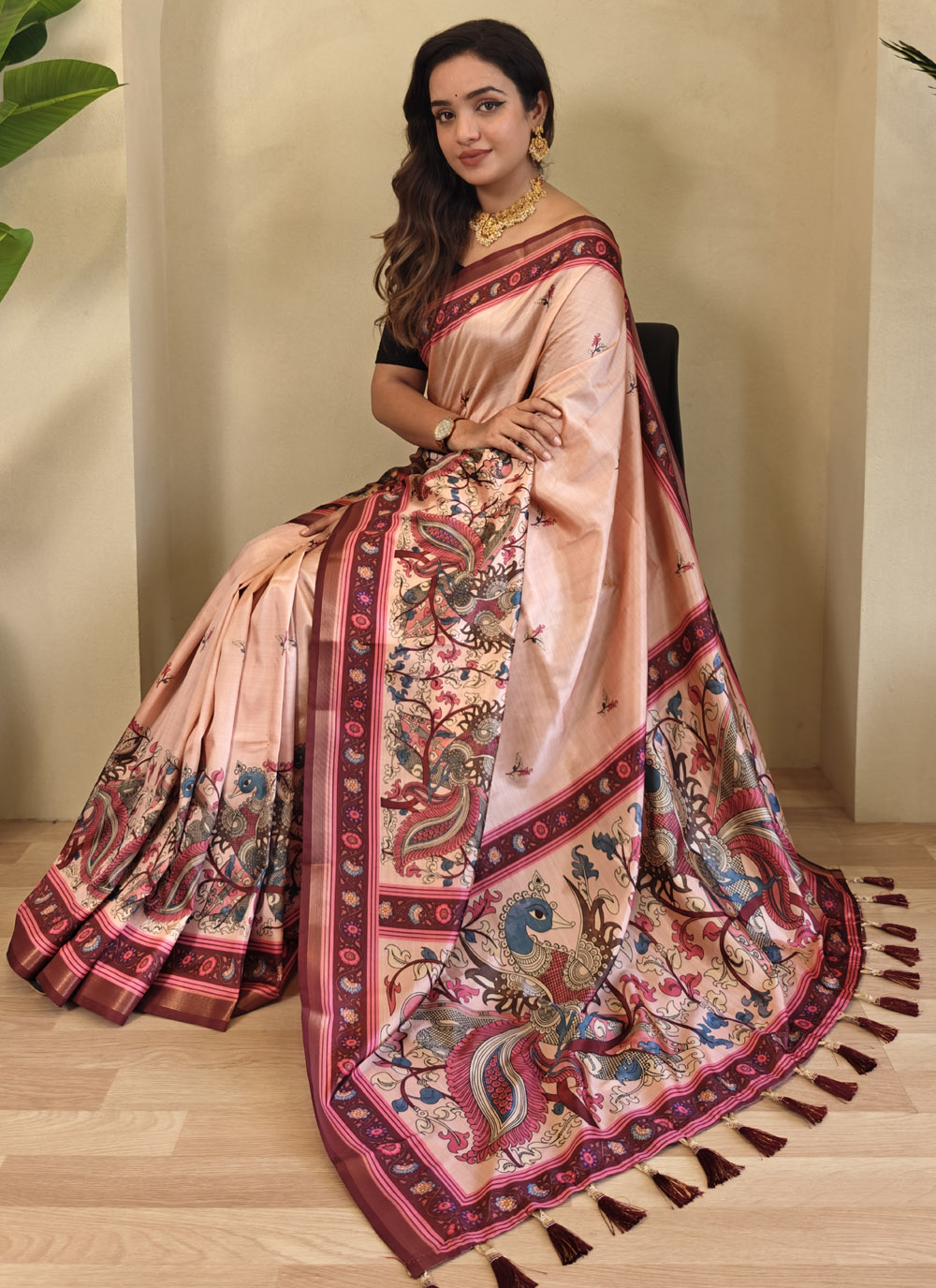 Embrace the delicate charm of peach paired with digitally crafted artistry. This saree is a perfect blend of tradition and trend. Its soft texture and natural fall make it an ideal pick for festival or celebrations. Comes with matching blouse.
