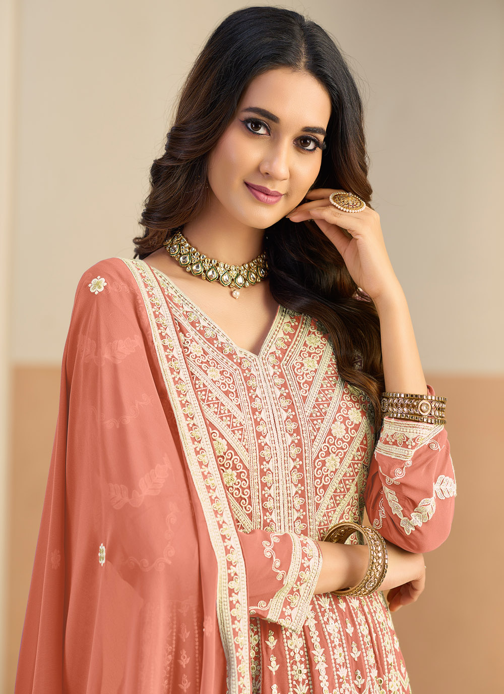 Experience timeless style with this Peach Faux Georgette Embroidered Trendy Salwar Kameez. The soft peach tone brings a fresh and feminine touch, while the embroidery detailing adds artistic sophistication. Comes with matching choli and dupatta.