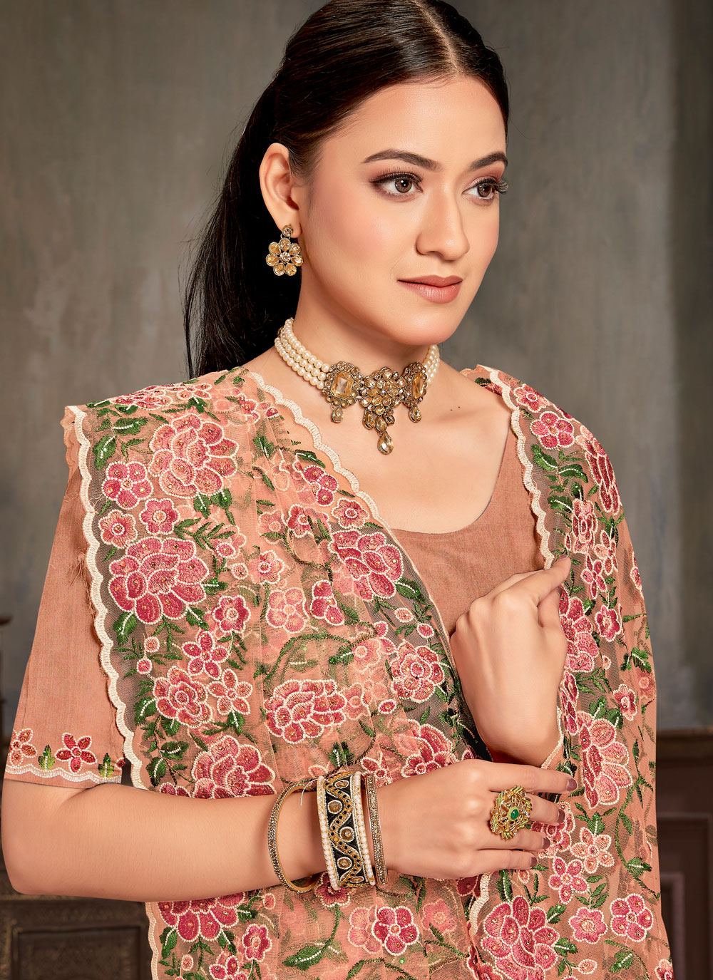 Add grace to your wardrobe with this Peach Classic Saree, adorned with beautiful embroidery, stones, and zari detailing. Paired with a matching blouse, it’s a perfect choice for any special occasion or festive event.