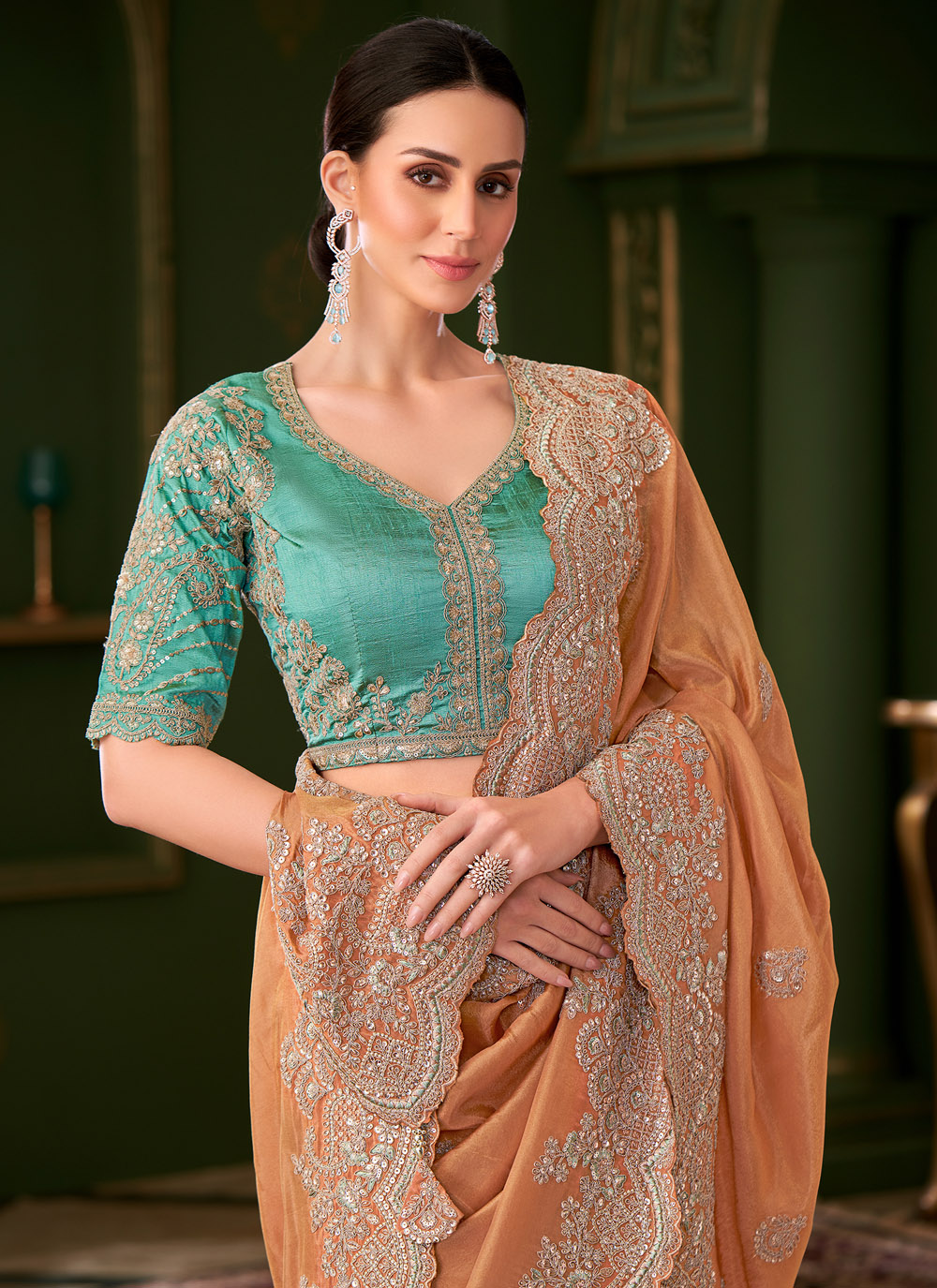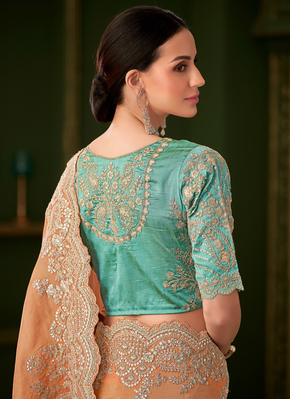 This peach embroidered saree in viscose georgette silk offers a soft and elegant appeal suited for traditional occasions. The embroidery adds delicate detailing that enhances the saree’s graceful charm without overpowering the overall look. It is an ideal choice for festivals, gatherings and celebrations. Comes with matching blouse.