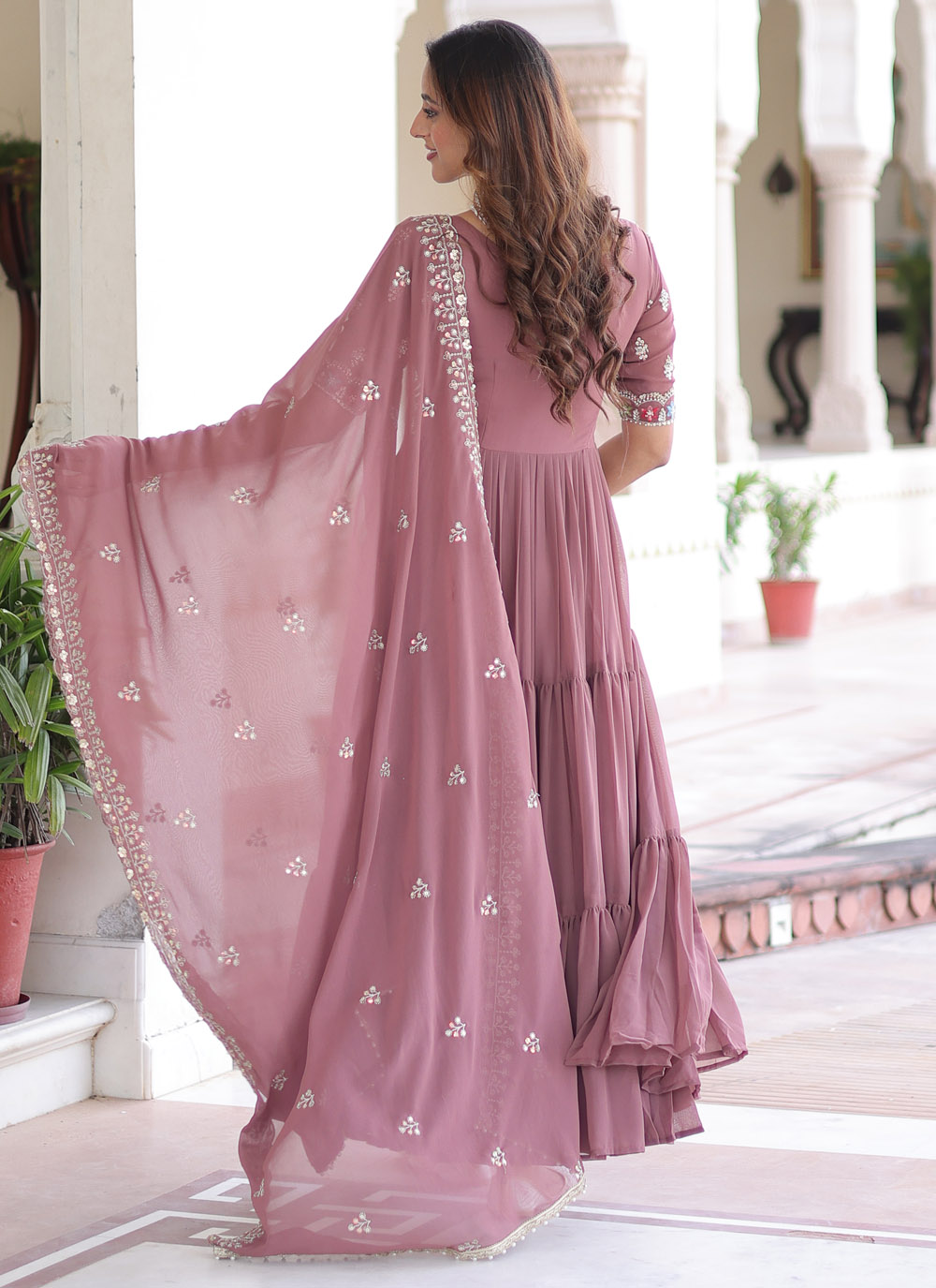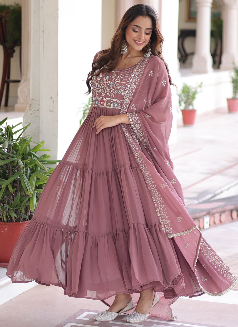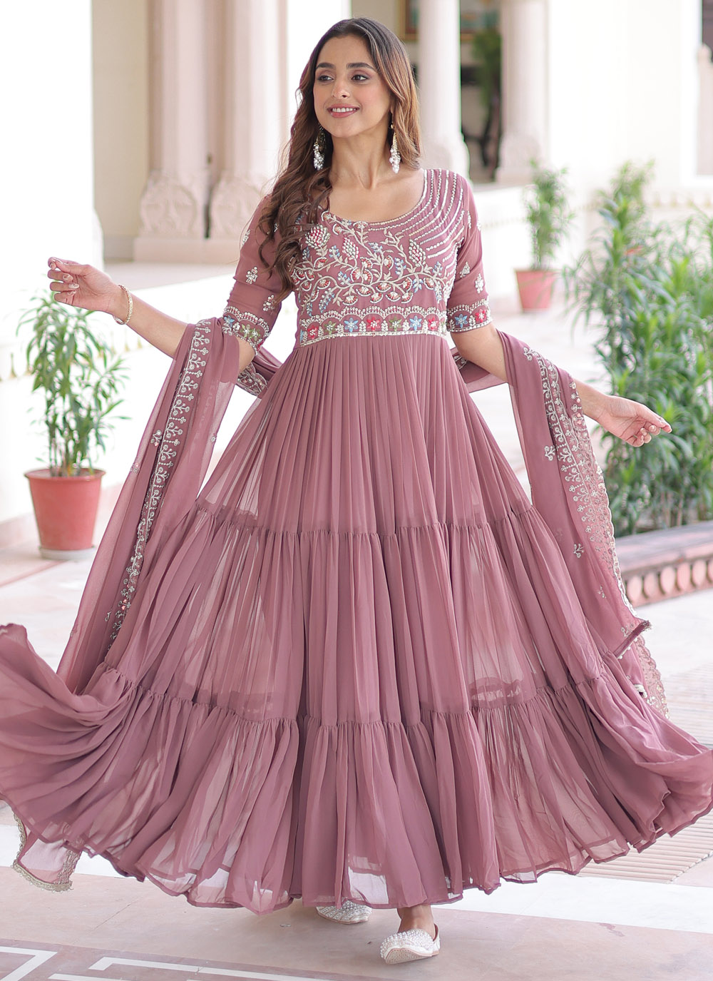 This peach faux georgette gown brings a fresh and elegant charm to any special occasion. Designed with intricate multithread embroidery, the outfit glistens beautifully thanks to delicate sequins and bead detailing. Its readymade finish ensures effortless wearing while keeping you stylish and comfortable. Comes with matching dupatta.