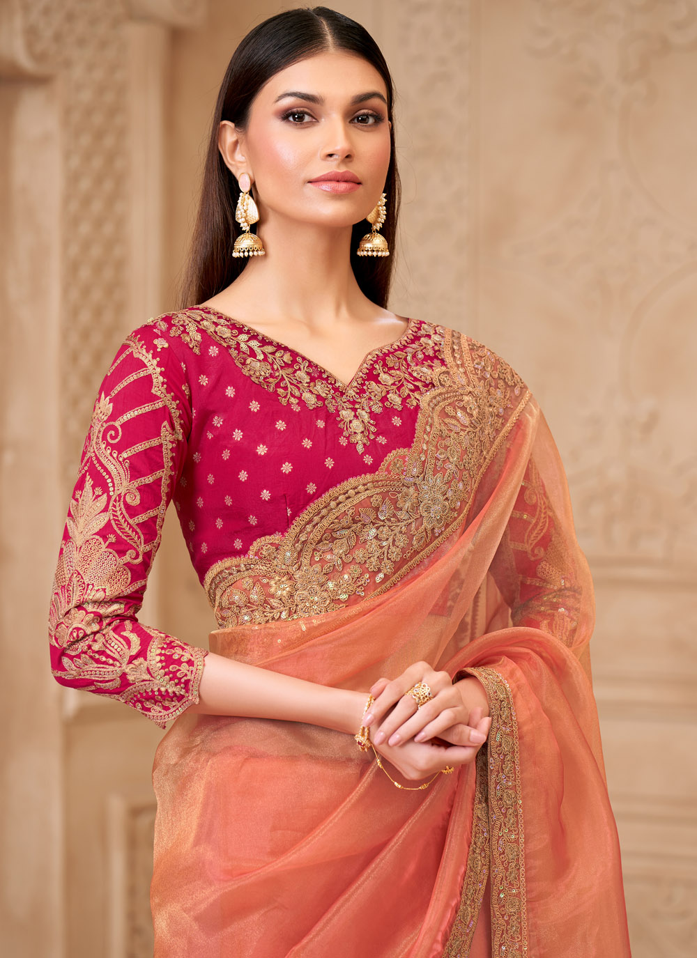 This peach georgette silk saree beautifully merges traditional embroidery with a modern color palette. The embroidered border adds richness while keeping the look contemporary and classy. Comes with matching blouse.