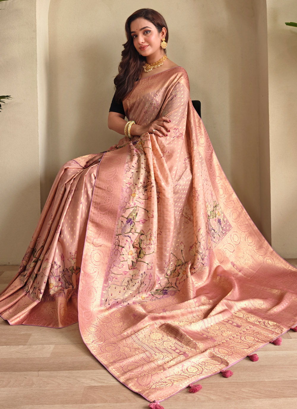 This Peach Georgette Viscose Saree is a masterpiece of contemporary design. The delicate weaving work provides a tactile richness, beautifully contrasting with the crisp, modern digital print. Comes with matching blouse.