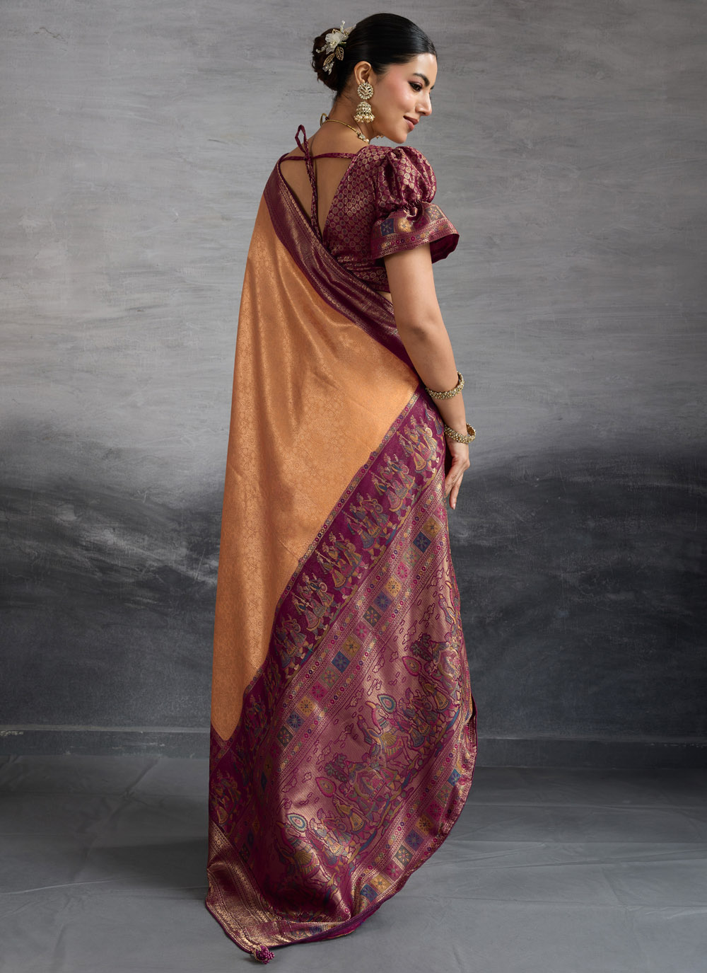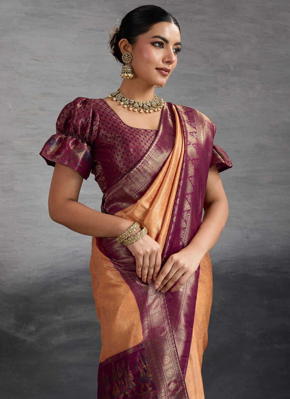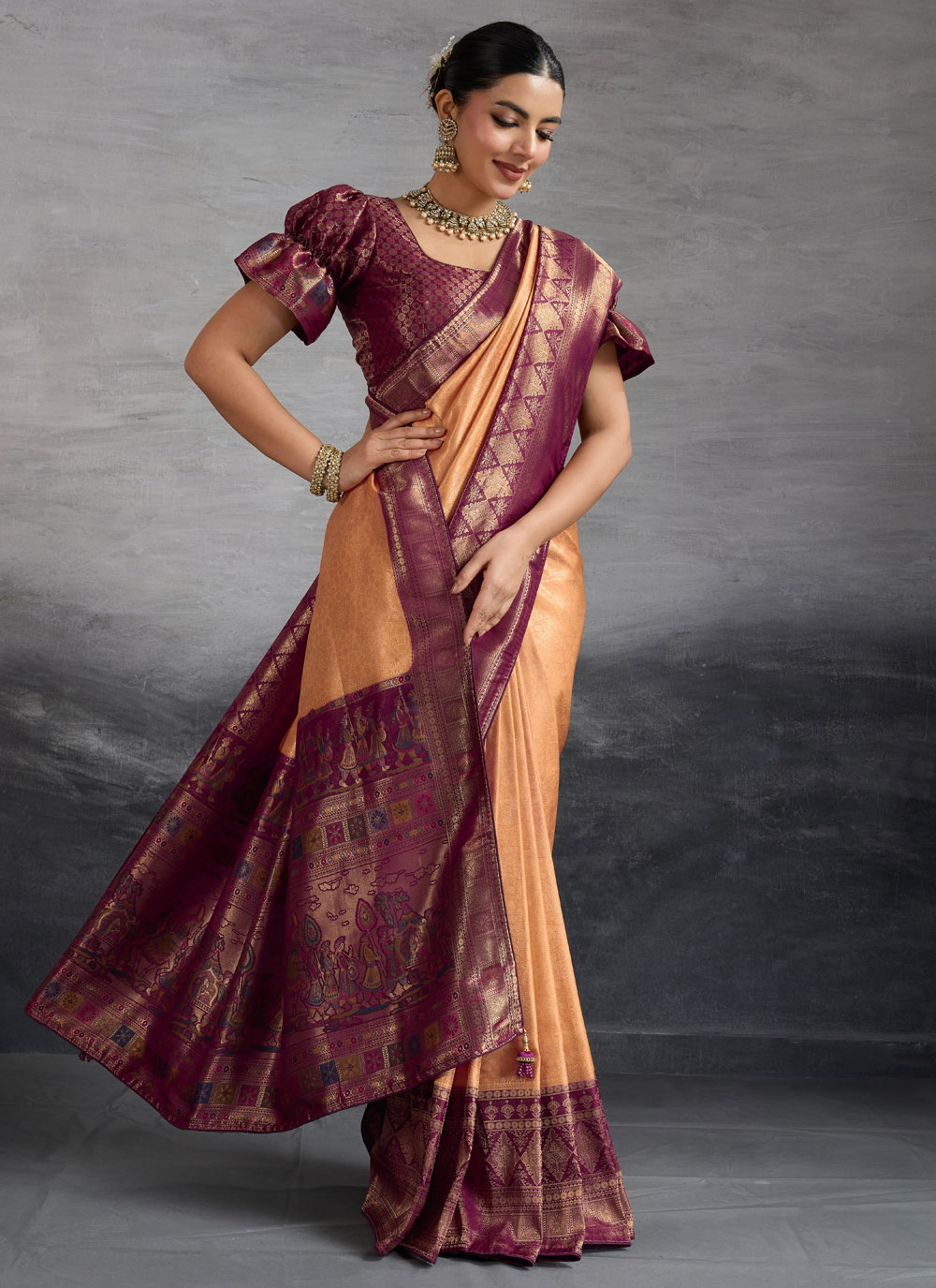 This saree reflects a balance of cultural heritage and modern elegance. Crafted in soft silk with meenakari zari woven motifs, the peach shade enhances its festive charm. Comes with matching blouse.