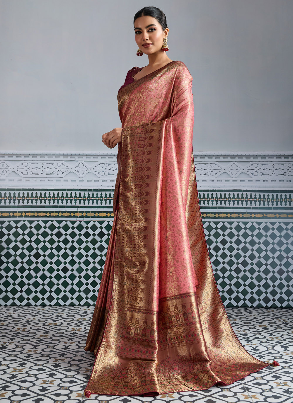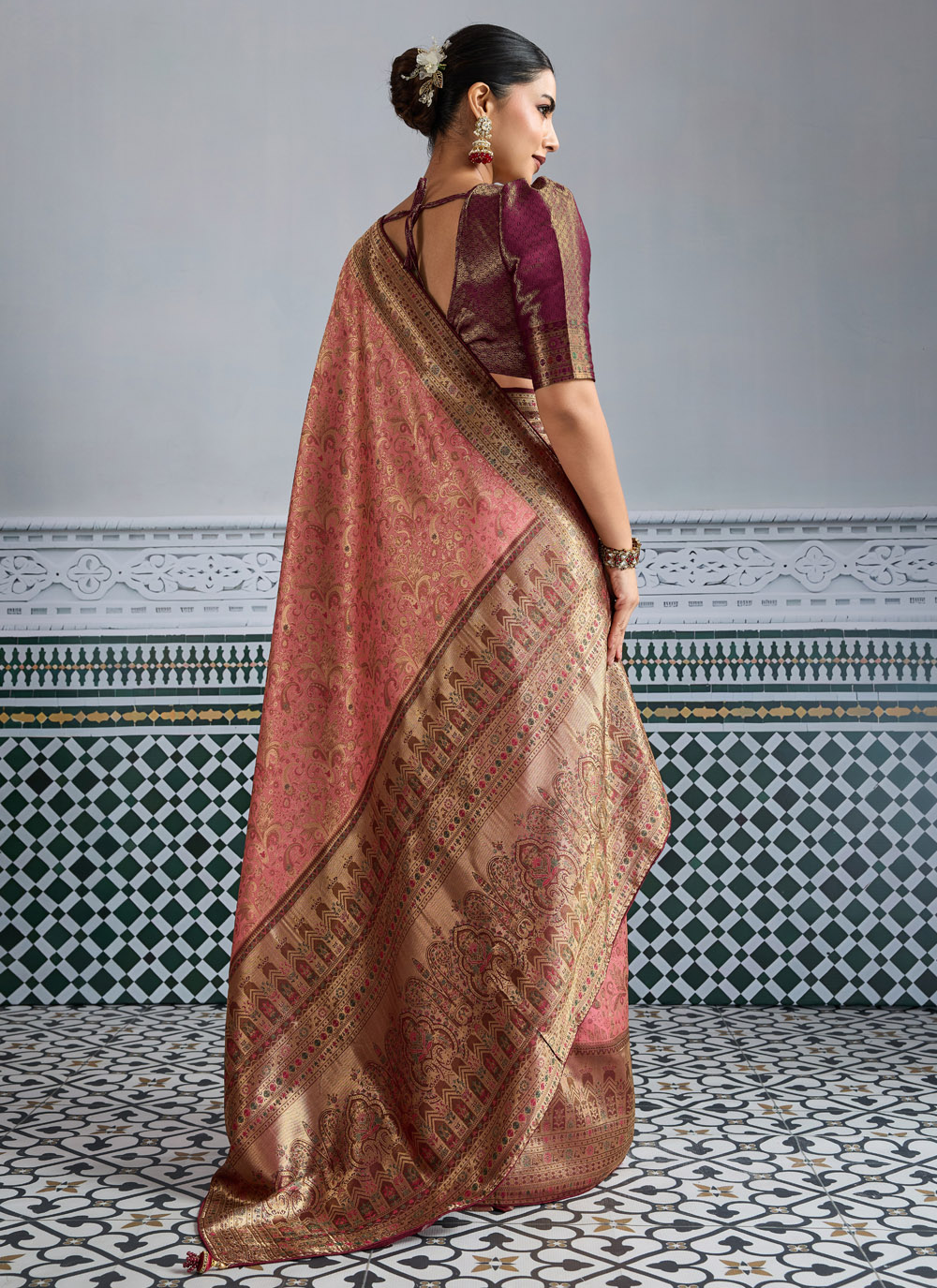 Celebrate festive moments in grace with this stunning Peach Kanjivaram Silk Saree, adorned with intricate Meenakari and zari woven work. The silk drape brings together heritage craftsmanship and a modern color palette. Comes with matching blouse.