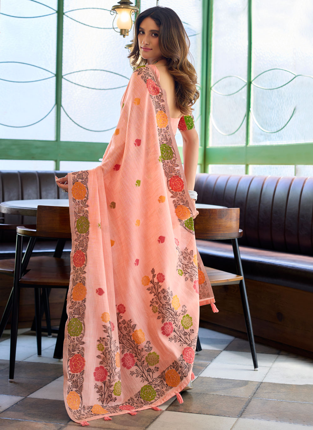 This Peach Linen Jacquard Fancy Work Traditional Saree presents a charming blend of simplicity and intricate craftsmanship. The textured jacquard pattern adds depth to the fabric, while the elegant fancy work detailing enriches the saree’s graceful peach tone. Comes with matching blouse.