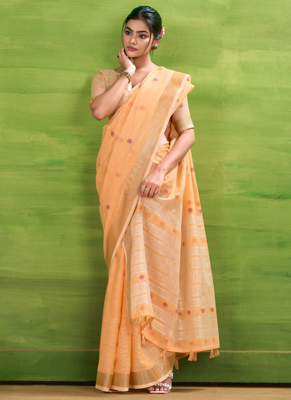 This casual linen saree in peach is finished with zari weaving, offering both comfort and beauty. A versatile piece for simple gatherings and daily ethnic styling. Comes with matching blouse.
