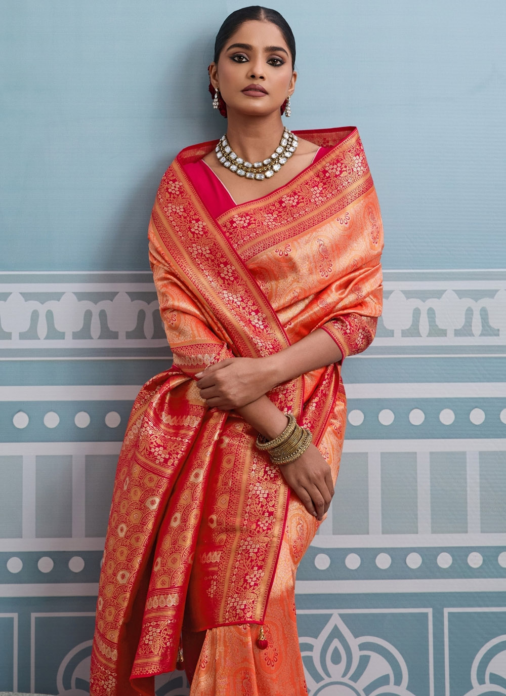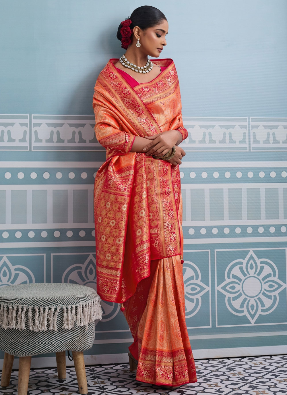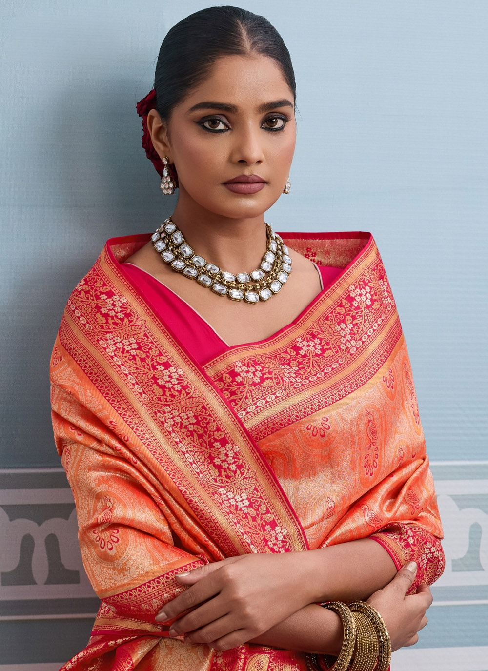 Grace your wardrobe with this peach meenakari Kanjivaram saree, featuring fine thread and zari weaving. Its delicate design combined with the richness of silk ensures a sophisticated look for festival wear or ceremonial events. Comes with matching blouse.