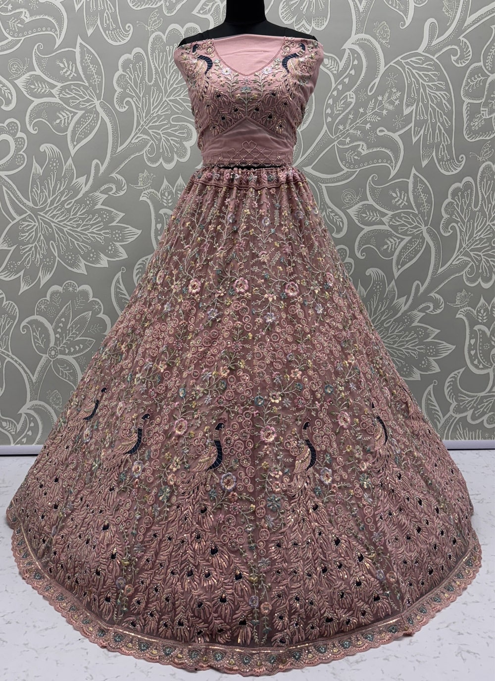 Grace your reception look with this enchanting Peach Net Lehenga Choli, exquisitely designed with dori thread embroidery, zarkan stones and sparkling diamond work. The soft peach tone exudes subtle sophistication, while the shimmering embellishments add just the right amount of glamour. Comes with matching choli and dupatta.