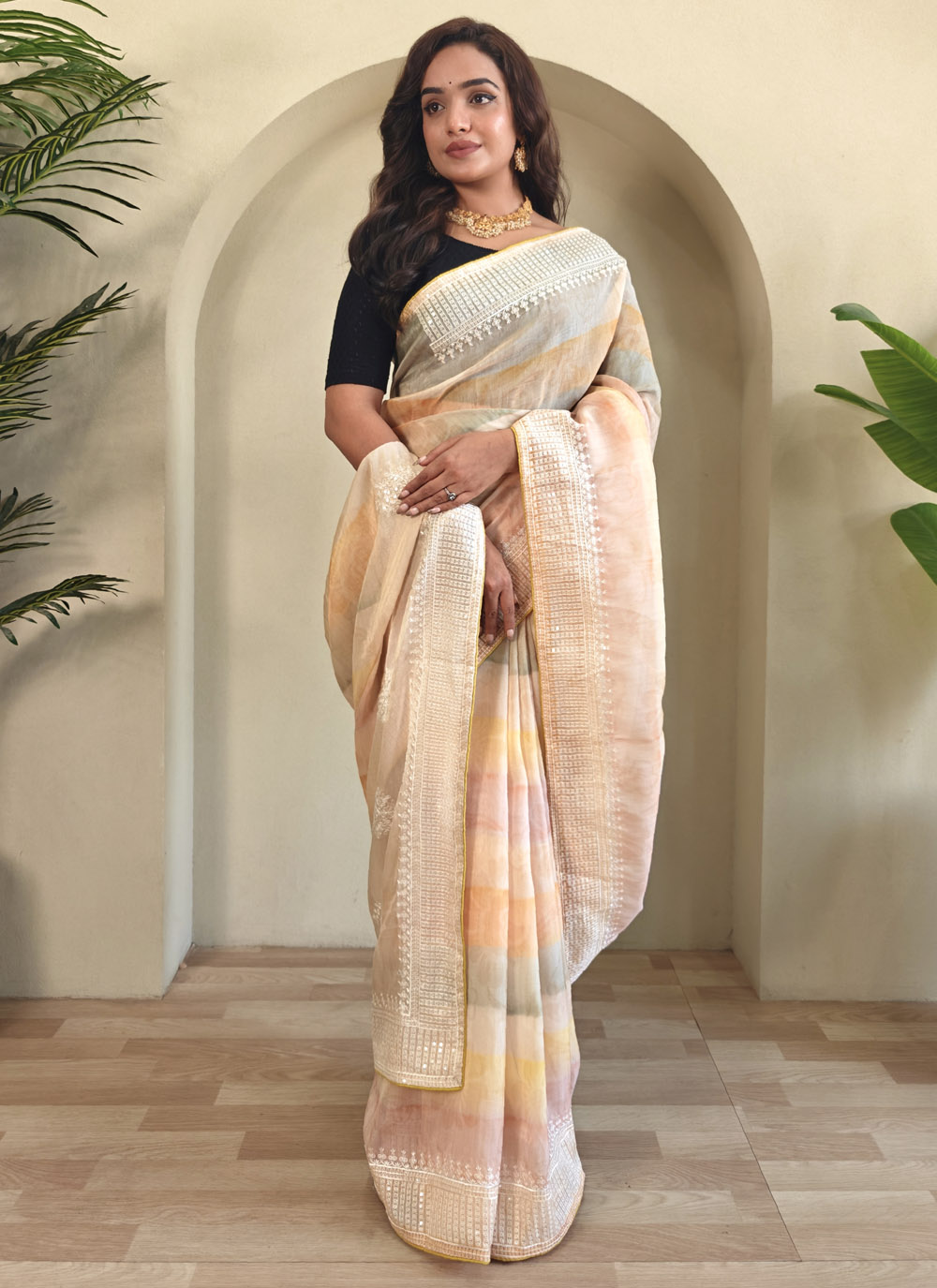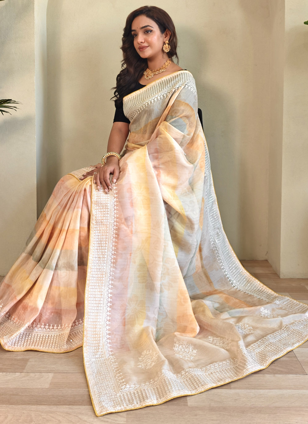 Celebrate elegance with a modern twist in this Peach Organza Saree, enhanced with glittering sequins work and striking digital prints. The lightweight fabric ensures easy draping, making it an ideal pick for festive occasions and weddings. Comes with matching blouse.