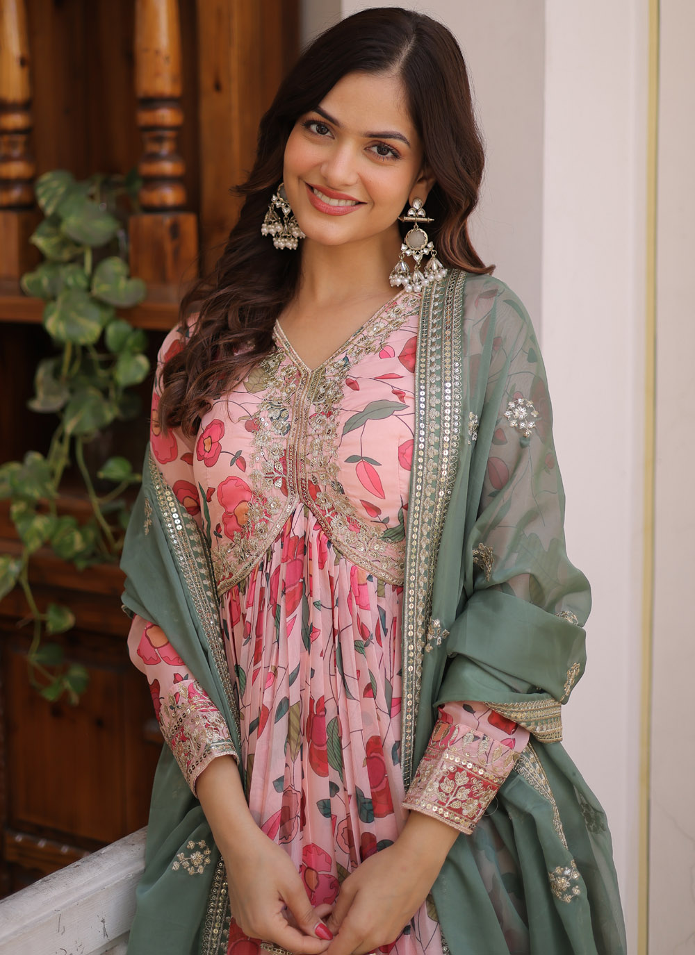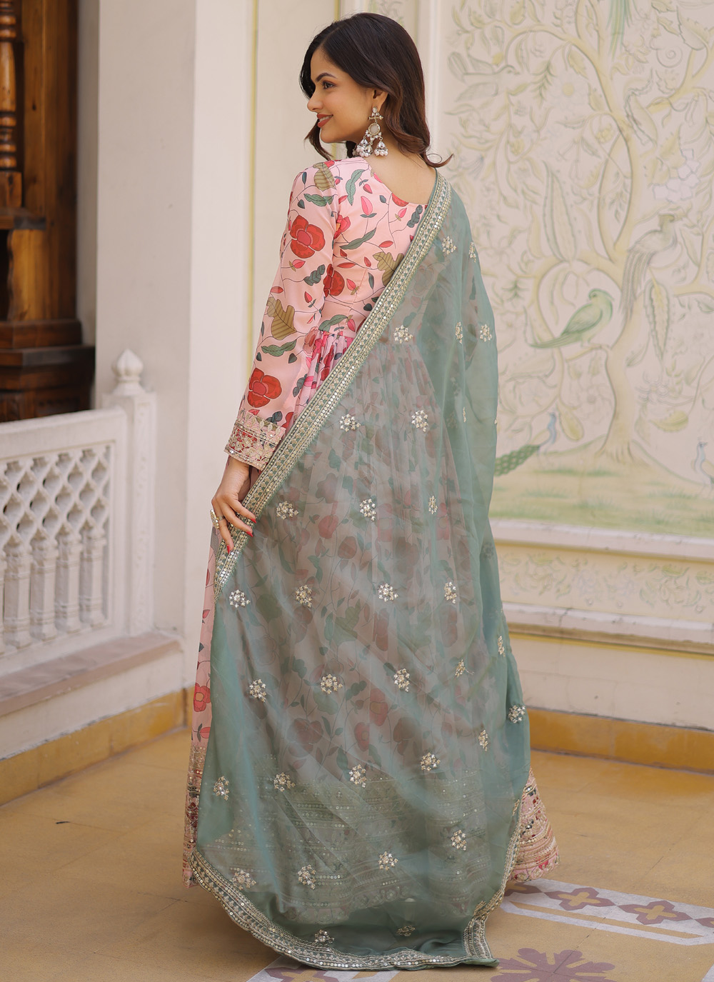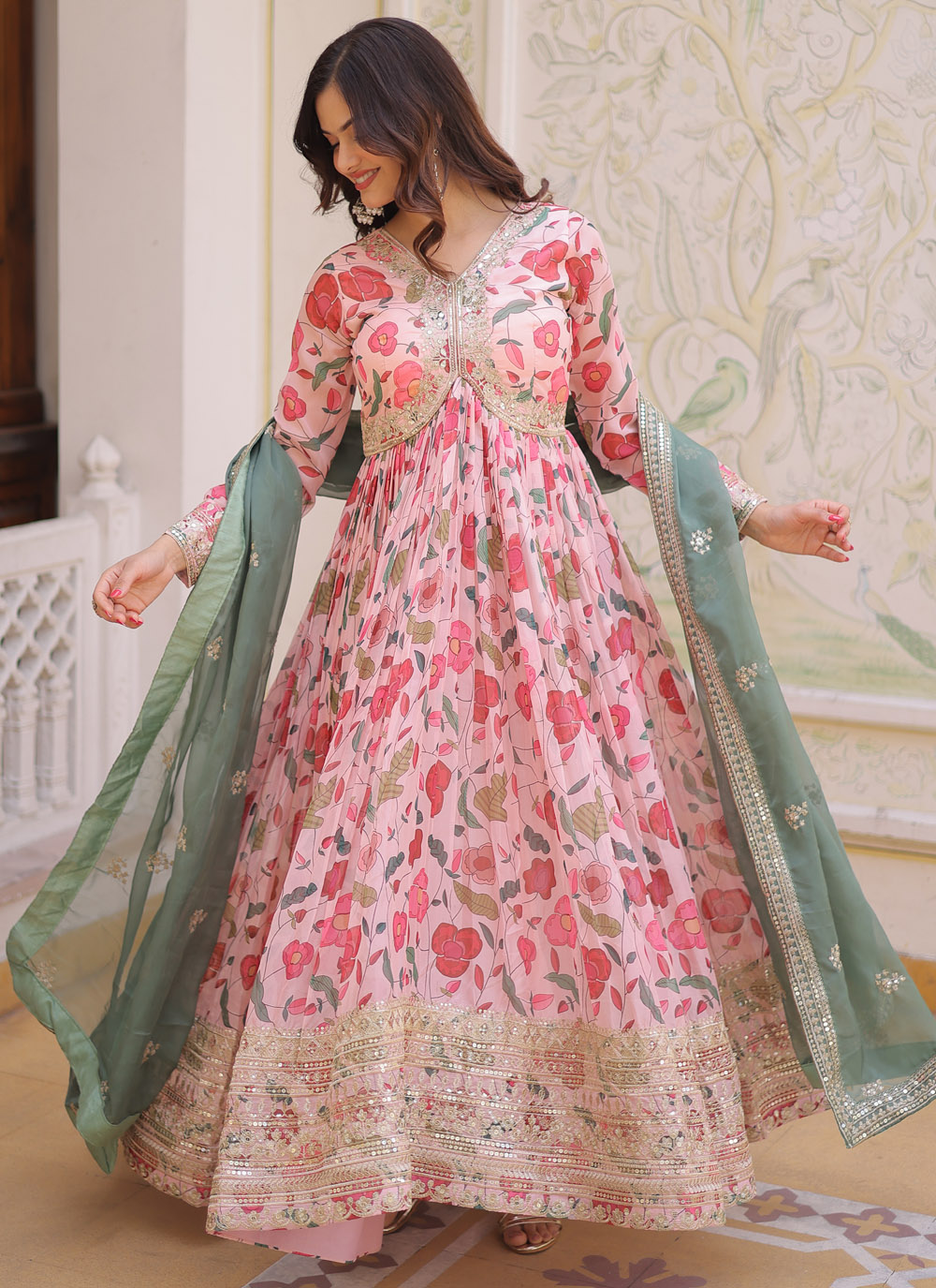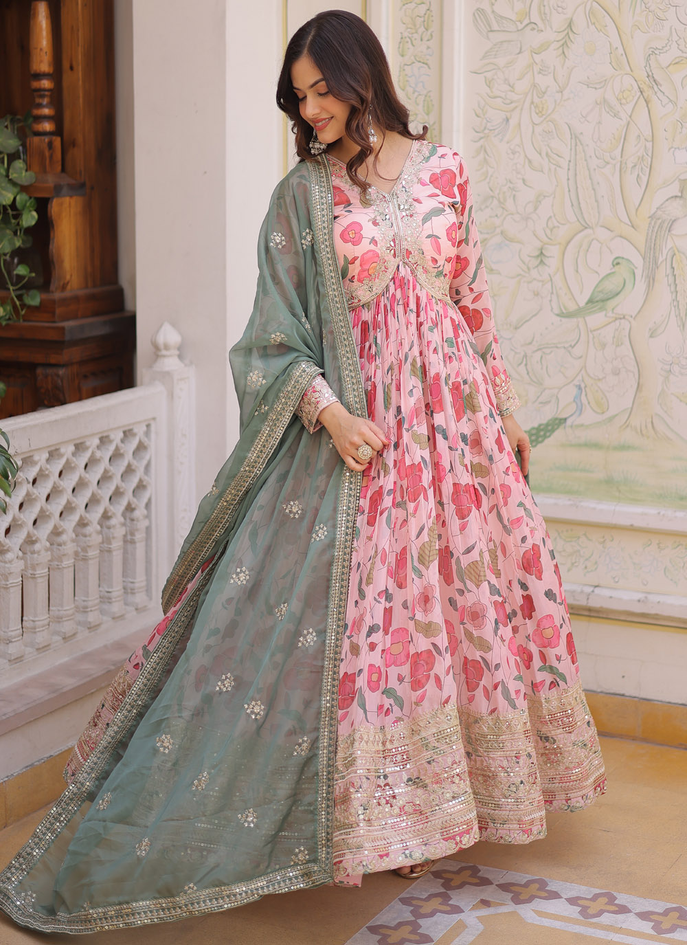 Turn every moment into a style statement with this Peach Silk Digital Printed and Zari Sequins Embroidered Designer Gown. Crafted in rich silk fabric, the gown features artistic digital prints enhanced with zari and sequin embroidery. Comes with matching dupatta.