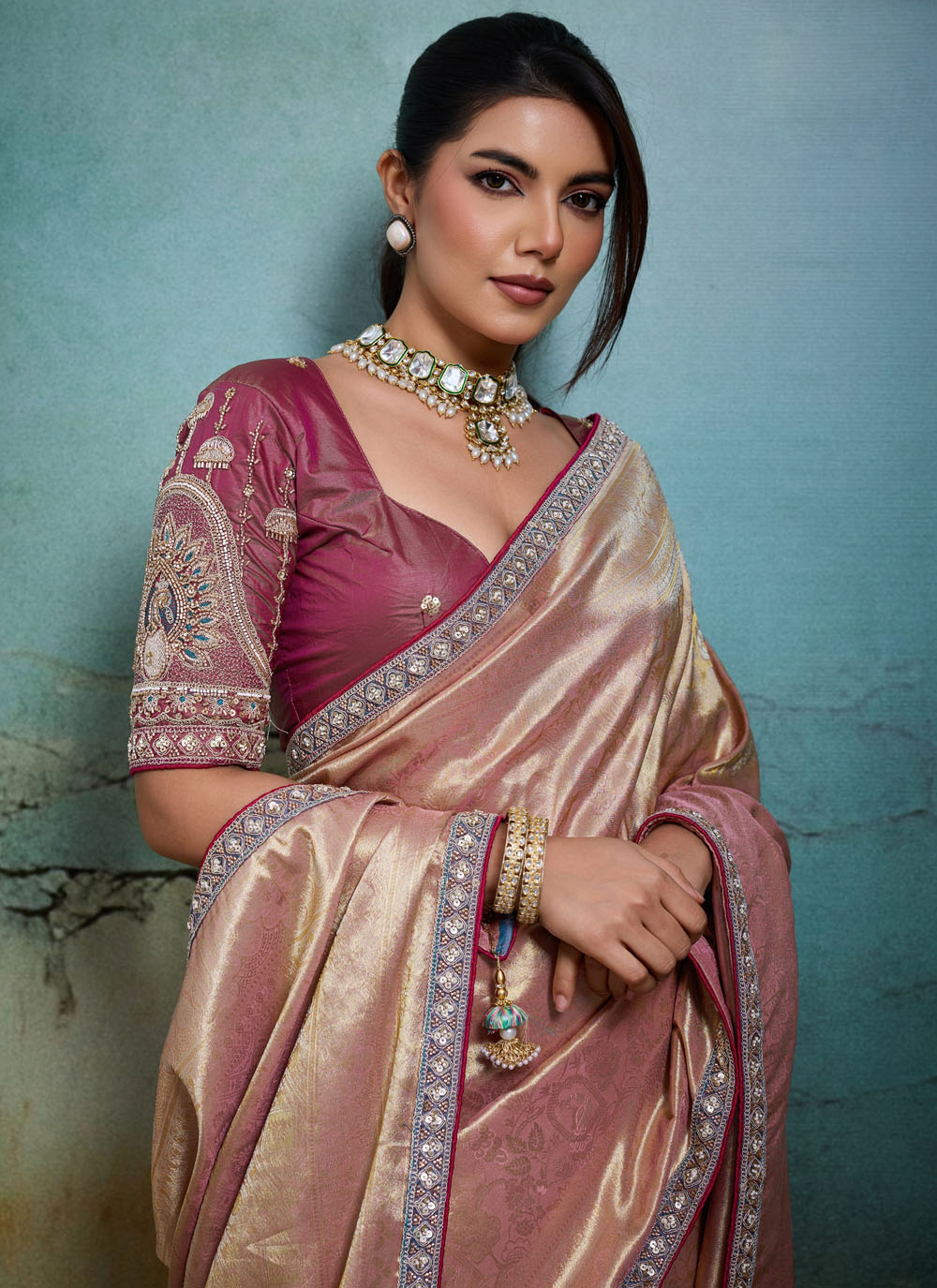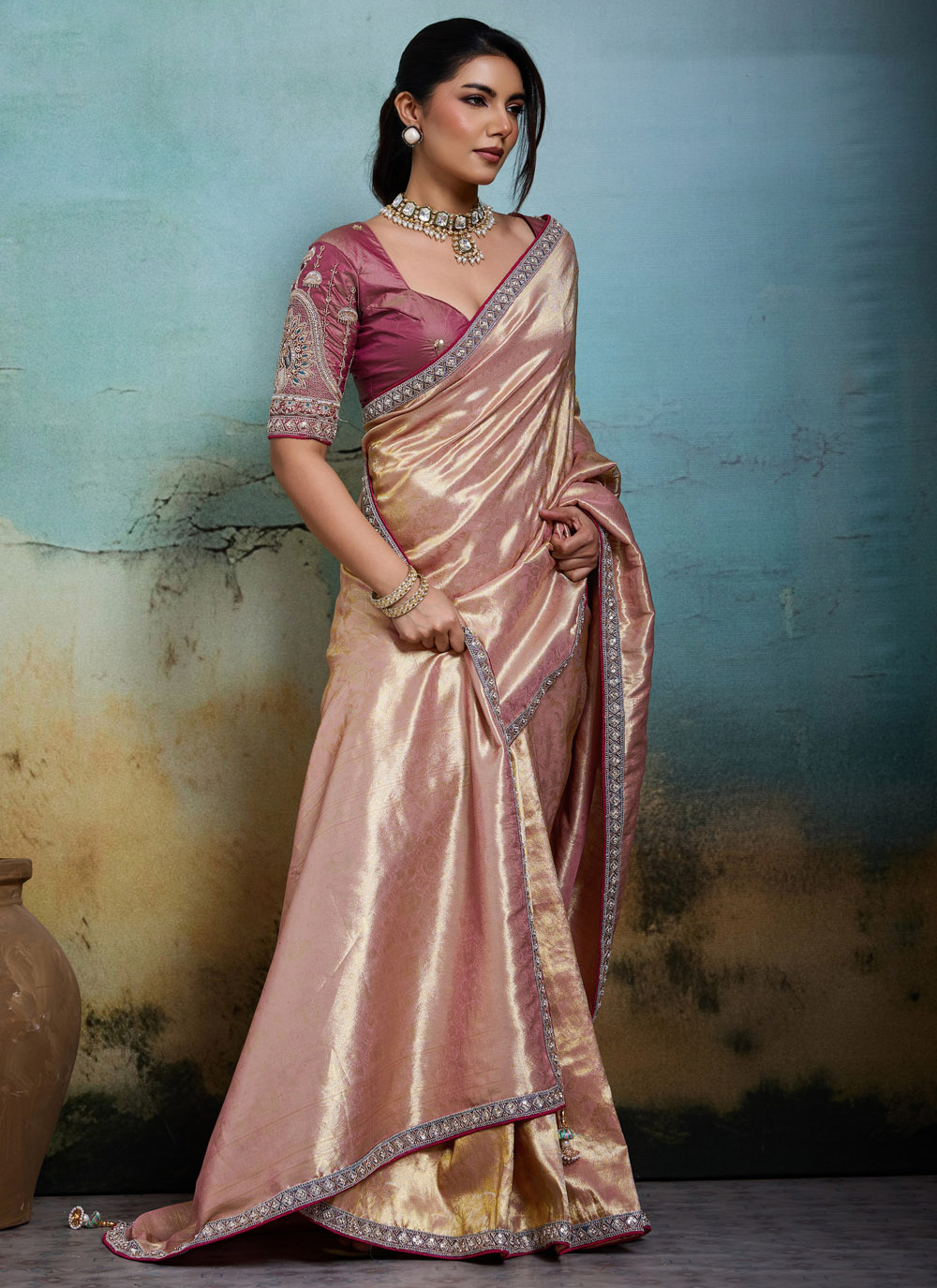 Add a modern touch to traditional wear with this peach Banarasi silk saree crafted in tissue fabric and decorated with beads, sequins, and lace work. Its clean drape and detailed finish create a stylish look. Comes with matching blouse.