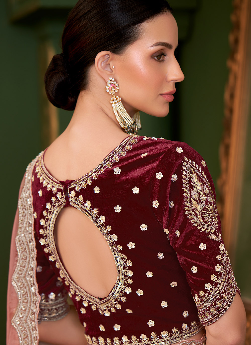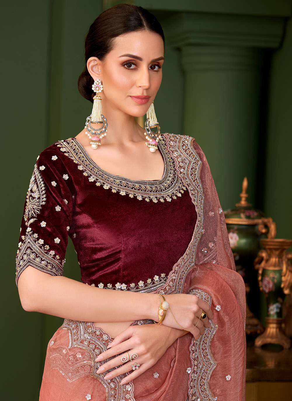 This peach tissue georgette silk saree carries a graceful traditional charm that is perfect for ceremonial occasions. The embroidery adds artistic accents that enhance the saree’s traditional appeal. Suitable for weddings, functions and festive gatherings. Comes with matching blouse.