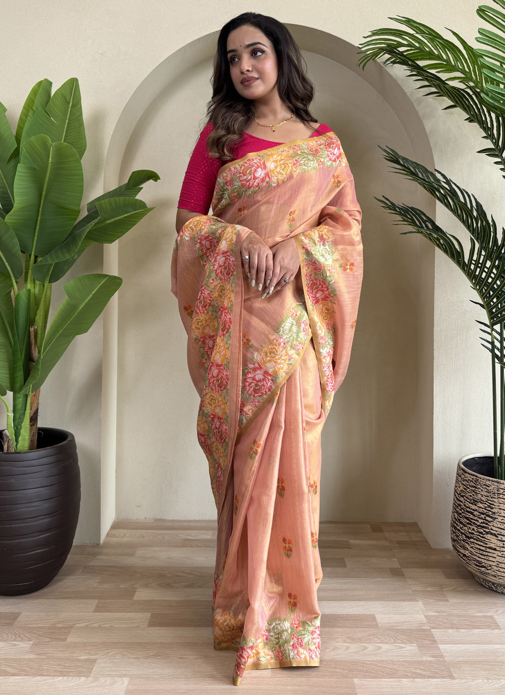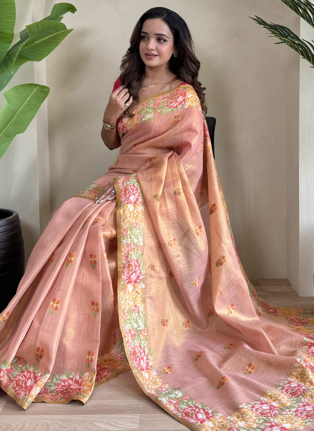 Drape yourself in tradition with this Peach Tissue Silk Saree featuring intricate jacquard weaving. The rich texture and classic design bring out a regal elegance, perfect for pujas, cultural events, and formal celebrations. Comes with matching blouse.