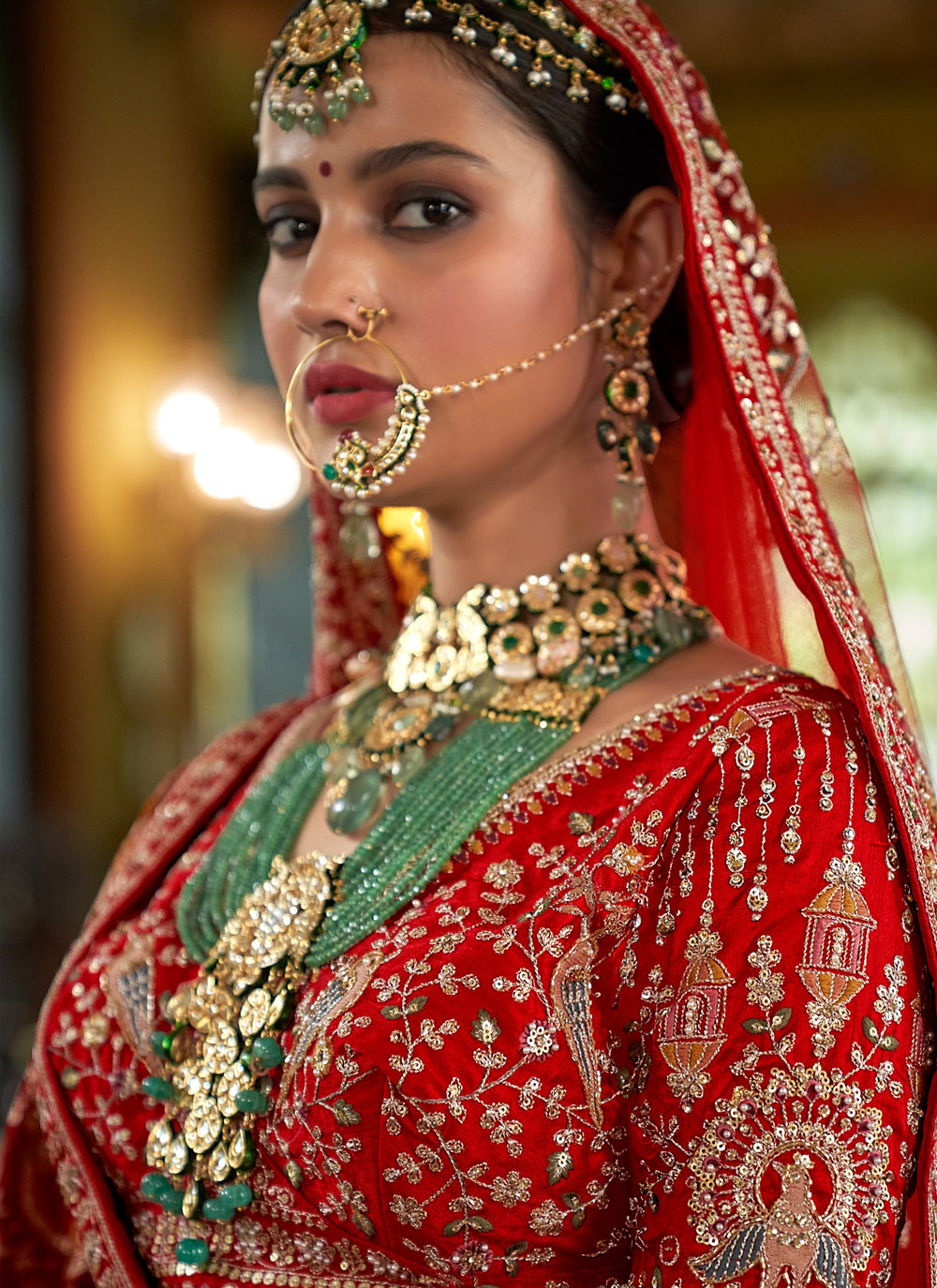This wedding-ready lehenga choli reflects skilled artistry through pearl embroidery, fine threadwork, shimmering sequins, and zari weaving across the silk base. Its vibrant red tone symbolizes tradition and festive grandeur. Comes with matching choli and dupatta.