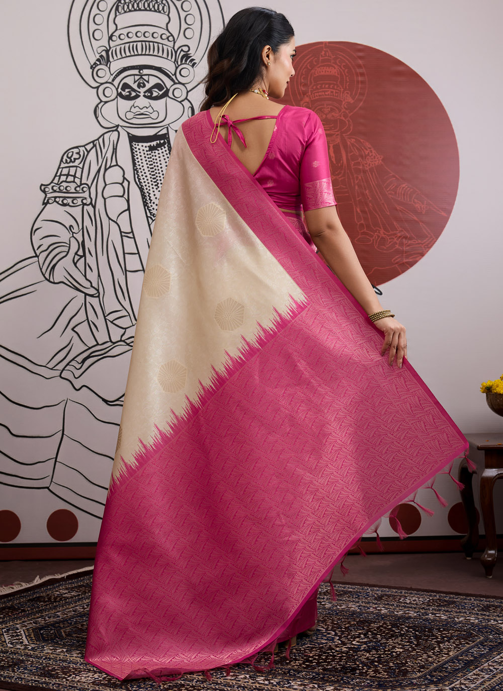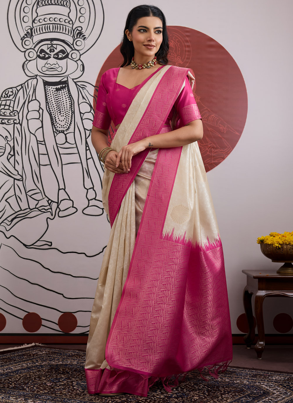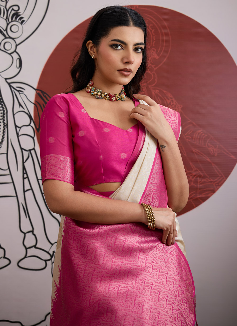 Crafted from premium handloom silk, this saree showcases finely woven zari patterns that add subtle richness. The pink and cream tones offer a refreshing style suitable for festive and modern occasions. Comes with matching blouse.