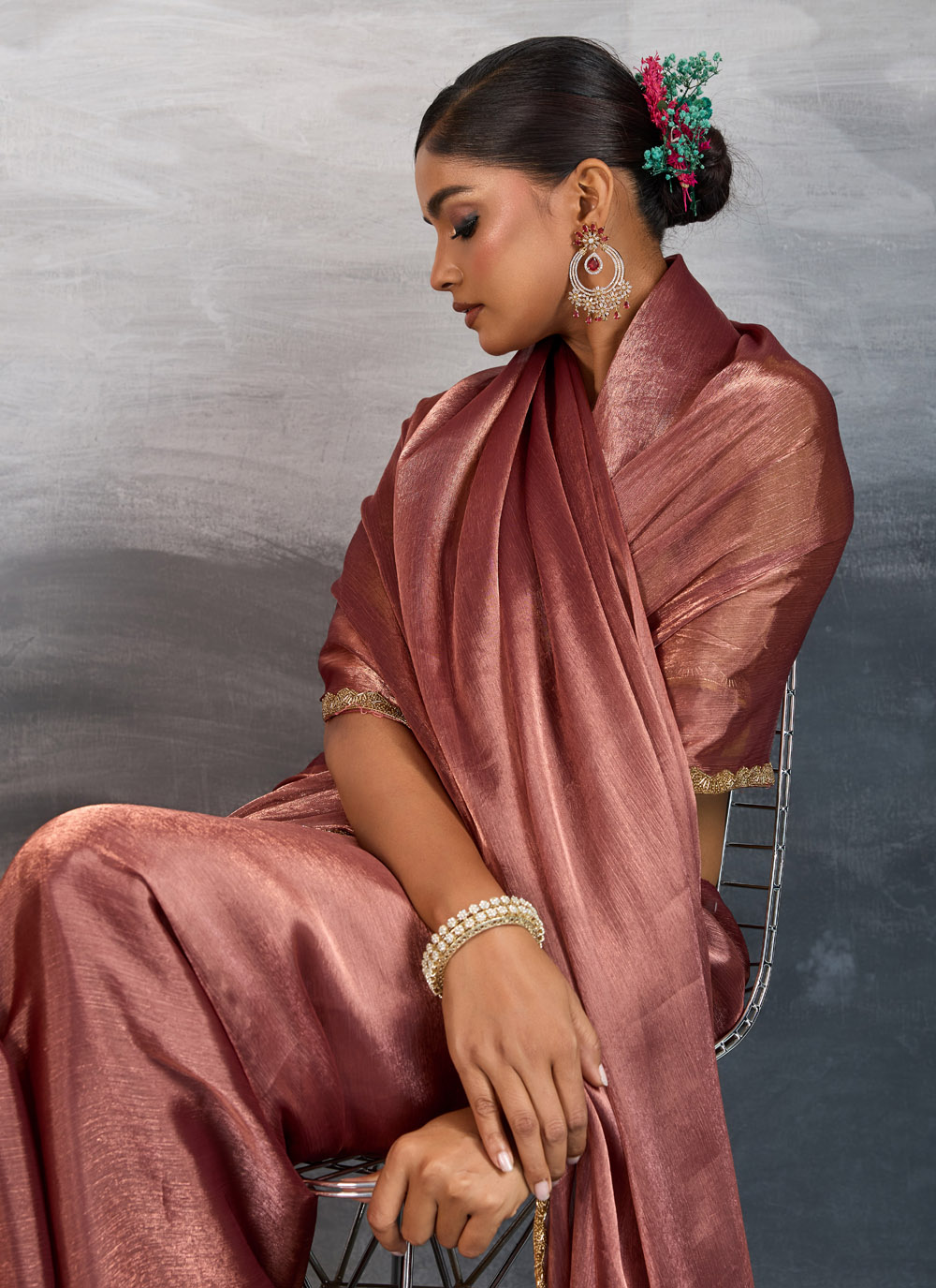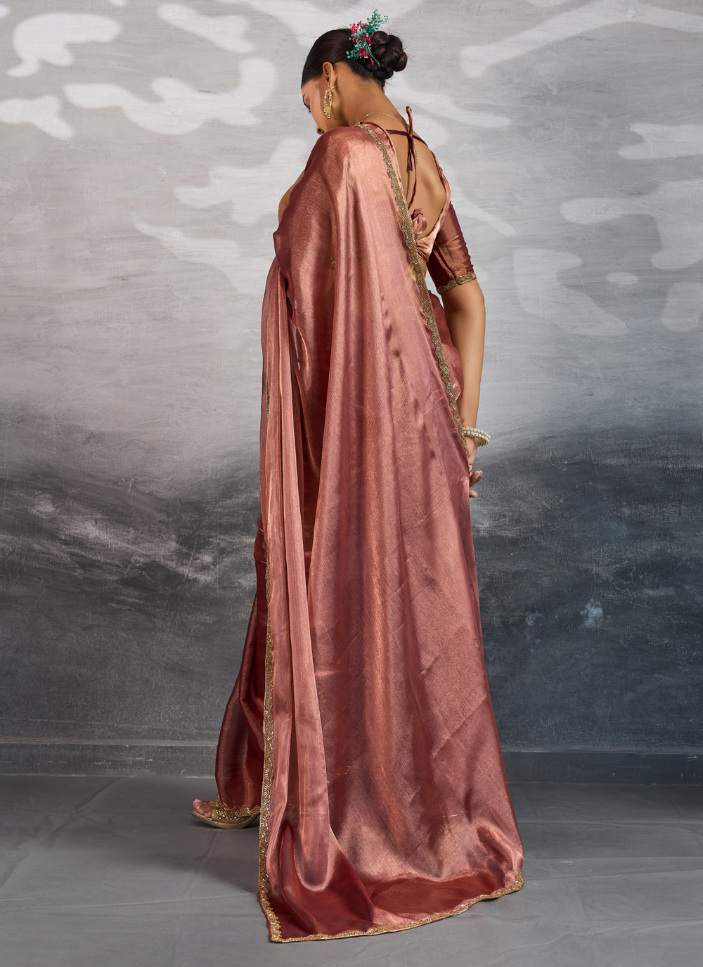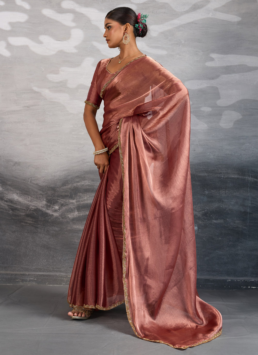 This Pink and Rust Chiffon Saree combines timeless craftsmanship with rich hues. The delicate cut dana and bead embellishments sparkle subtly against the soft chiffon, while the patch border adds structure and style. Comes with matching blouse.