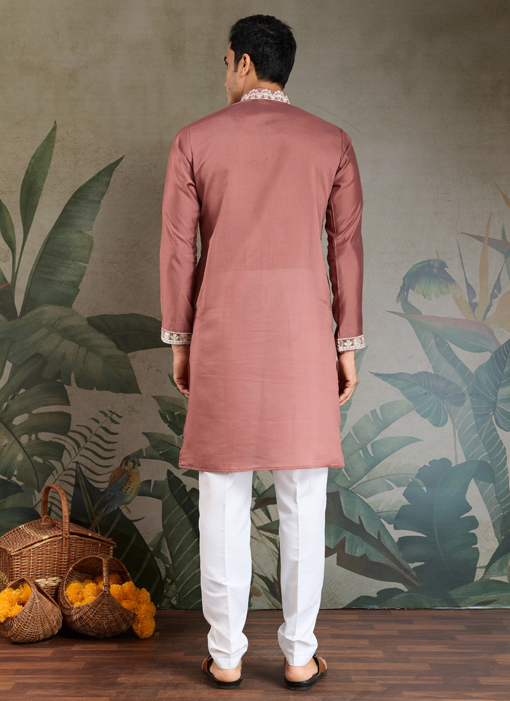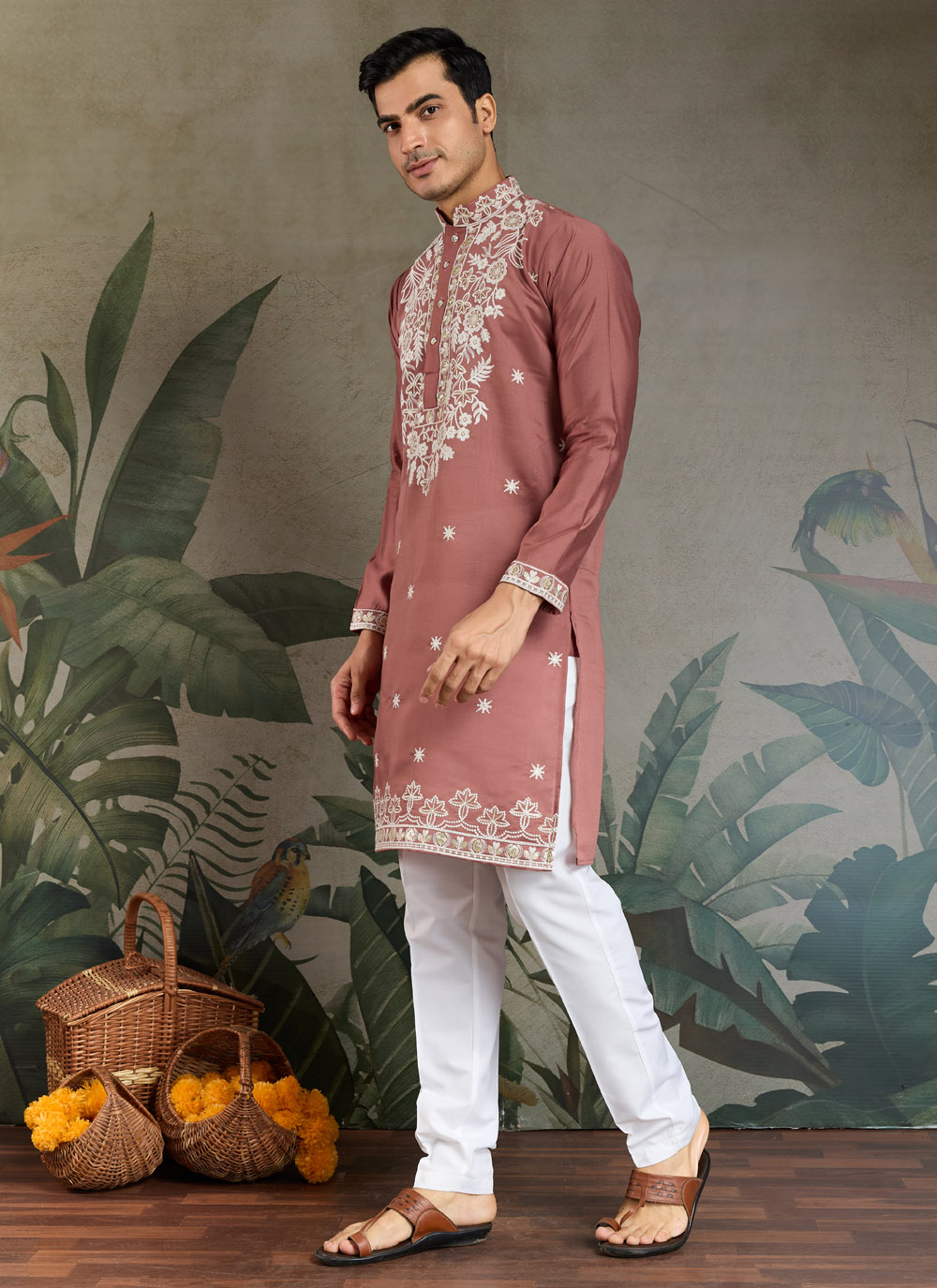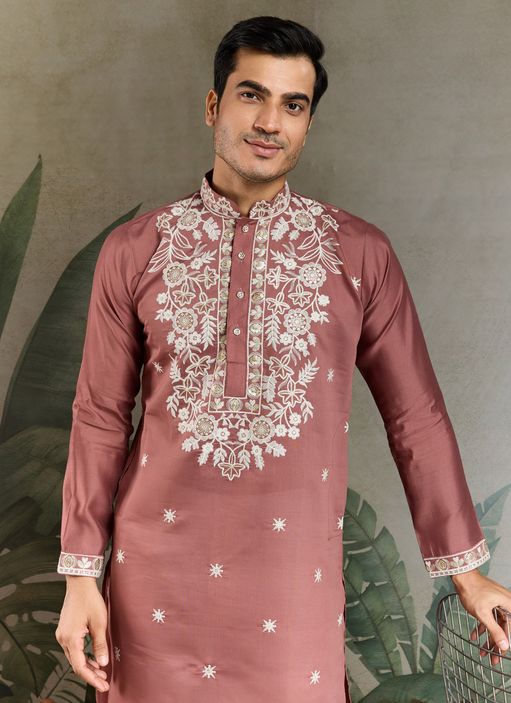 Stand out in this dual-tone pink and rust viscose kurta adorned with intricate thread embroidery. The vibrant hues paired with soft, breathable fabric make it ideal for festive gatherings and cultural events.