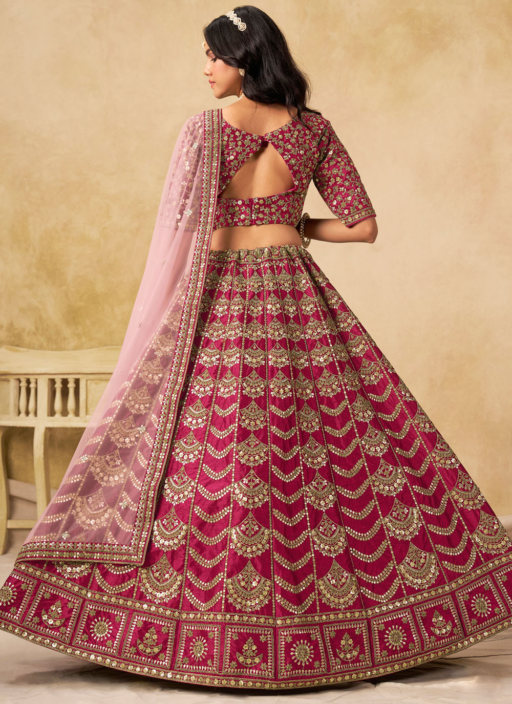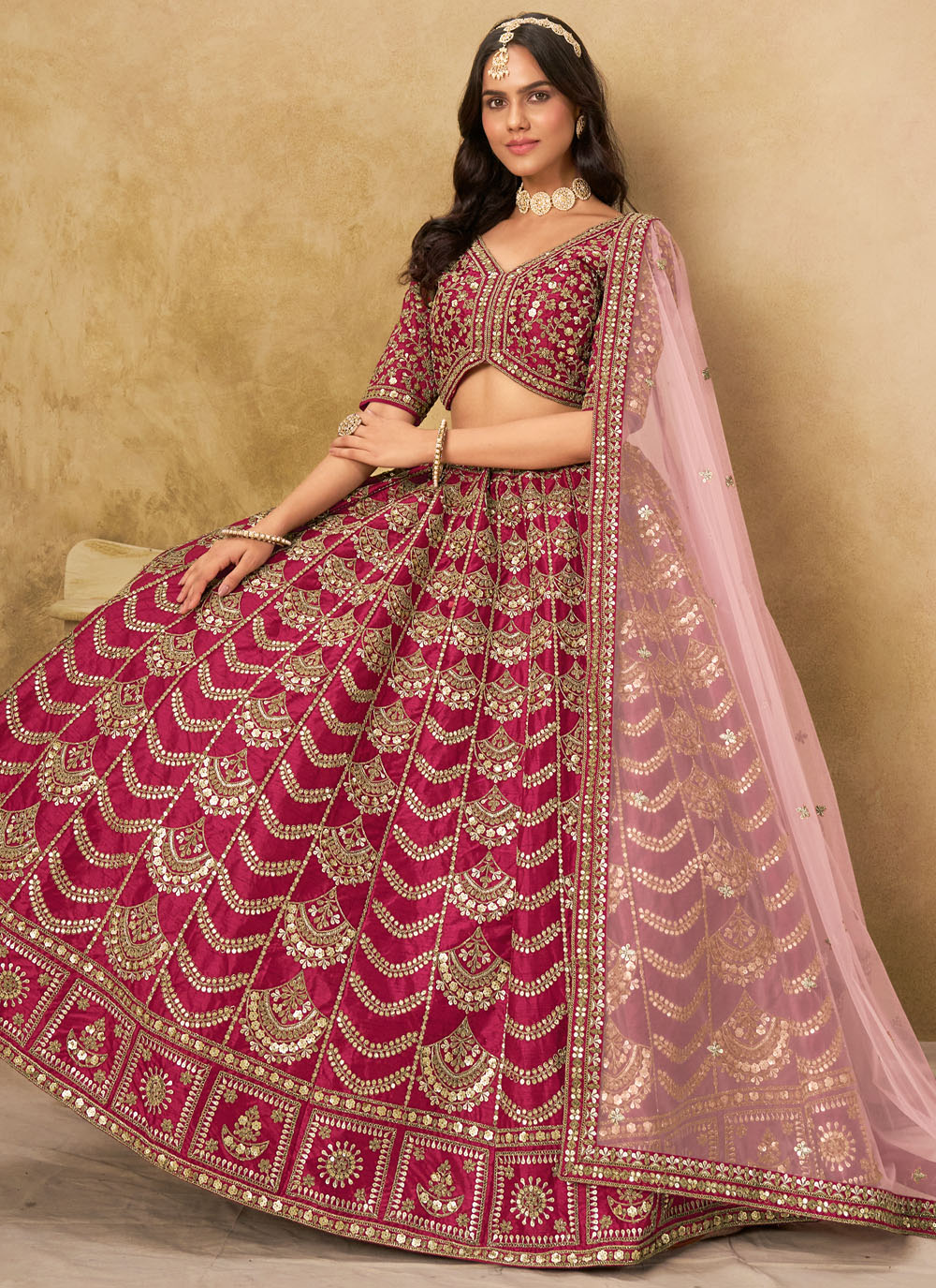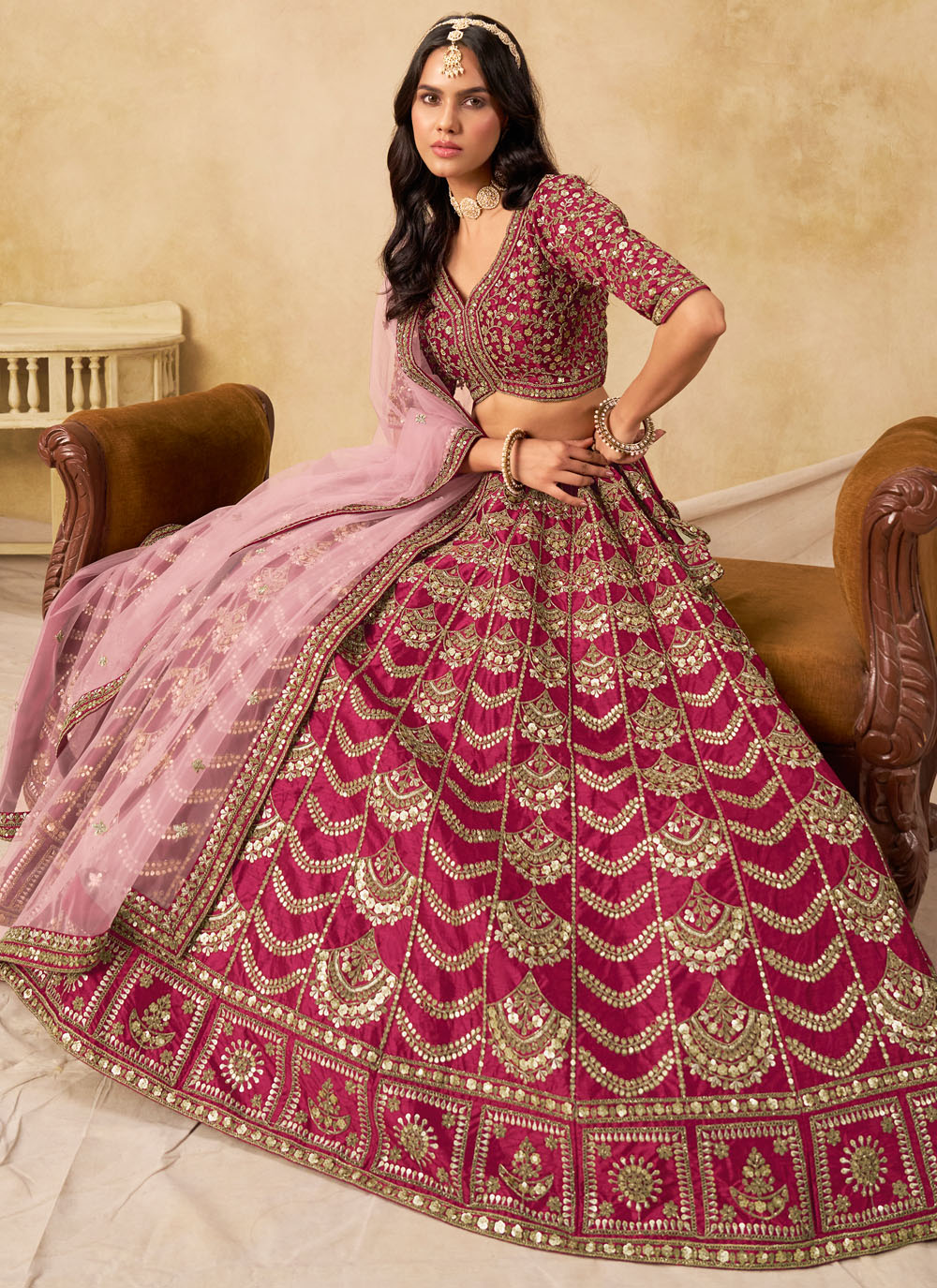 This lehenga choli is crafted from smooth art silk that adds a natural shine and elegant flow. The fabric feels lightweight while giving a rich, premium drape, making it suitable for day and night celebrations alike. Comes with matching choli and dupatta.