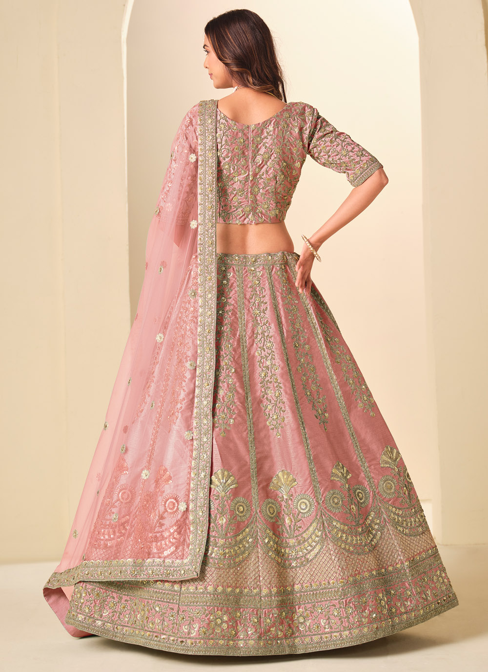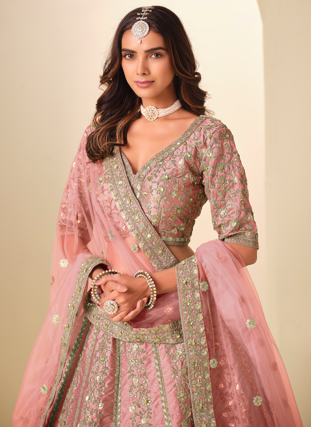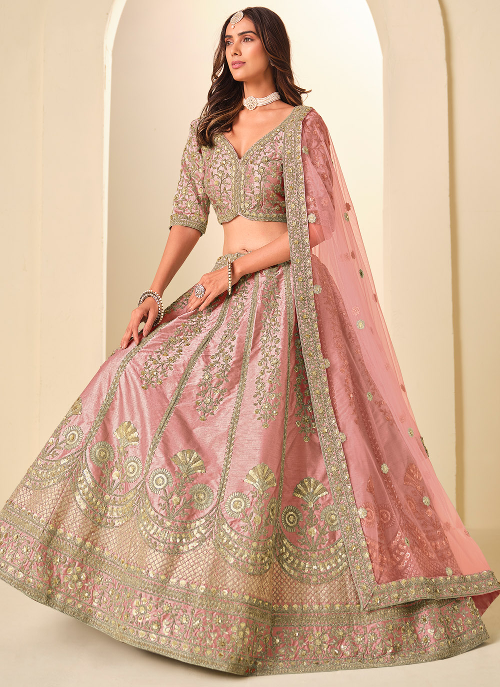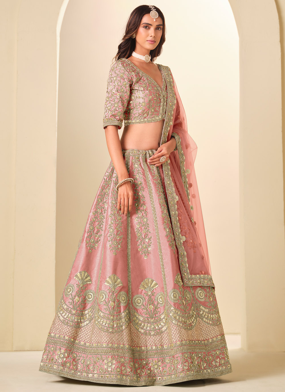 Designed for modern brides, this Pink Art Silk Lehenga Choli showcases fine resham embroidery adorned with subtle sequins work. The soft pink hue complements the elegant design, making it suitable for engagement ceremonies and grand functions. Comes with matching choli and dupatta.