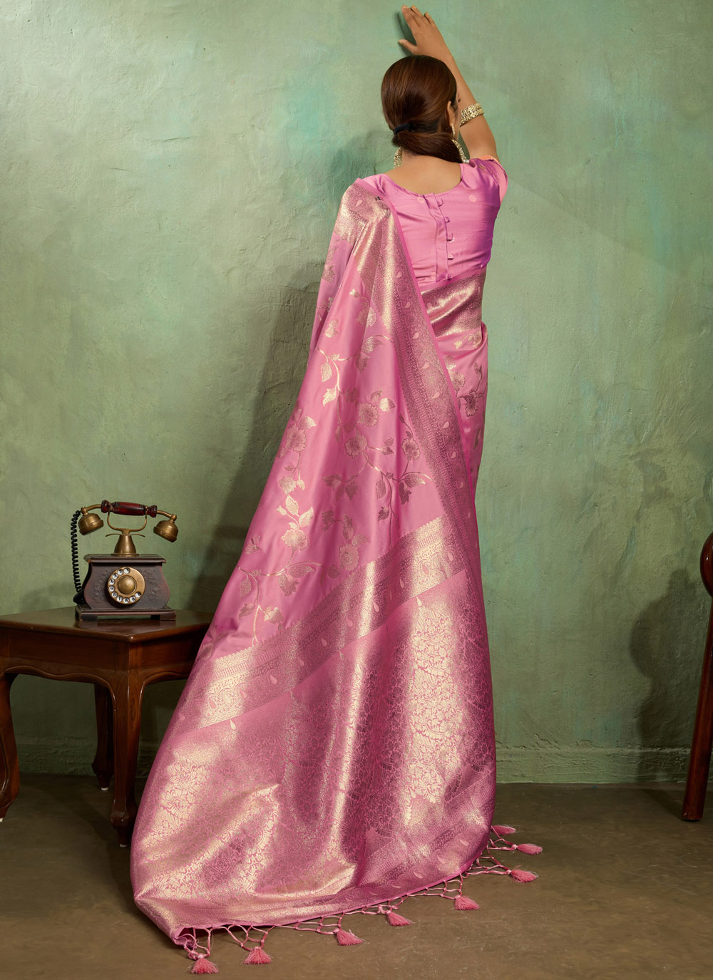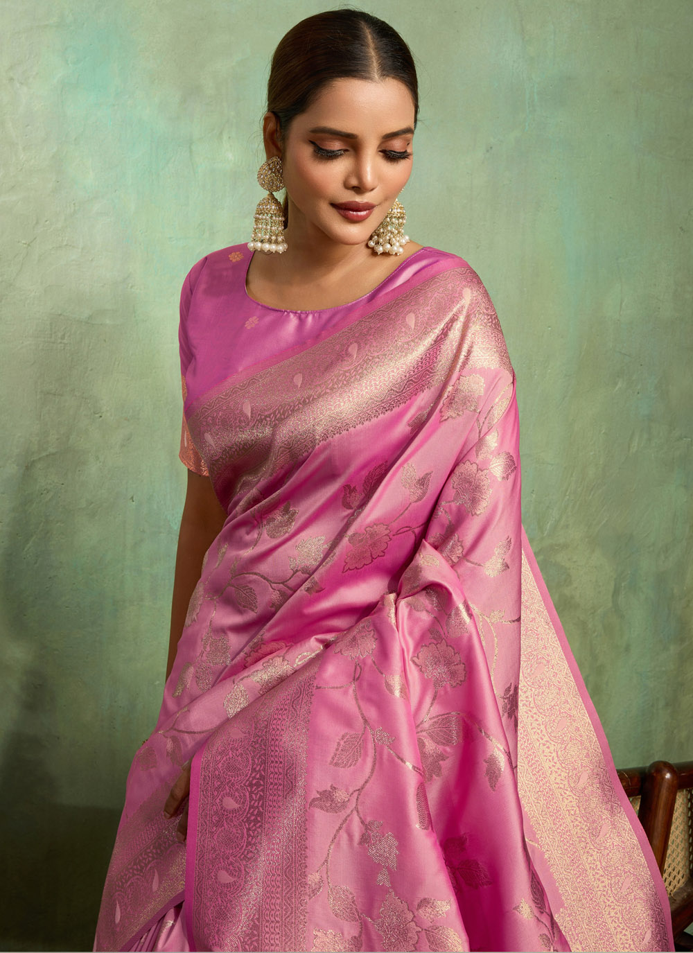 Elevate your casual look with this trendy pink Banarasi silk saree, designed with zari weaving and meenakari accents. The delicate artistry paired with the glossy silk base makes this drape both stylish and timeless. Comes with matching blouse.