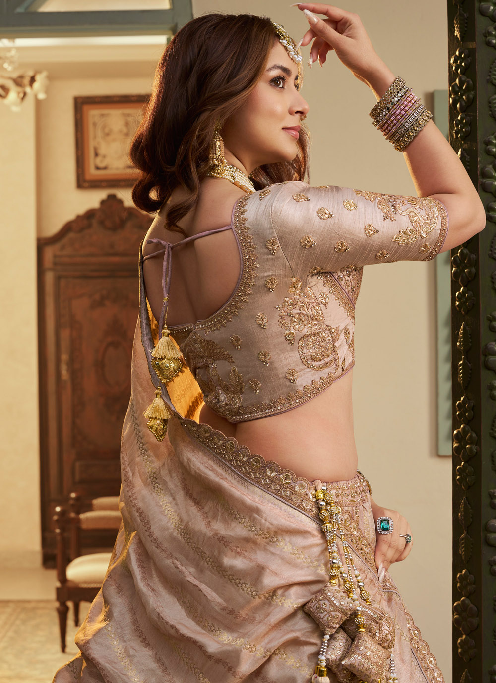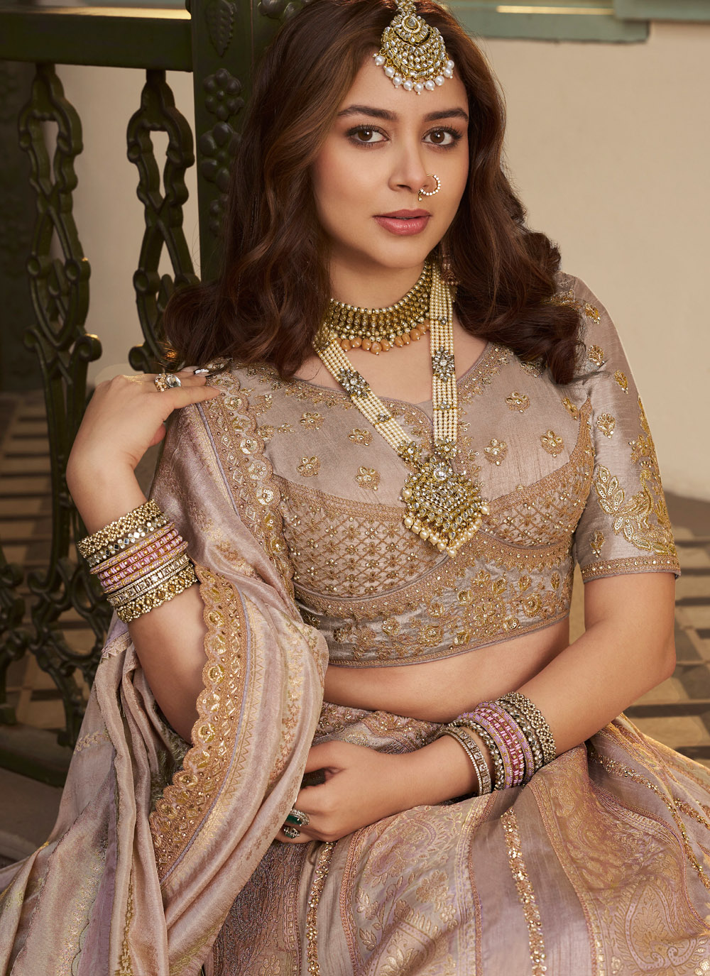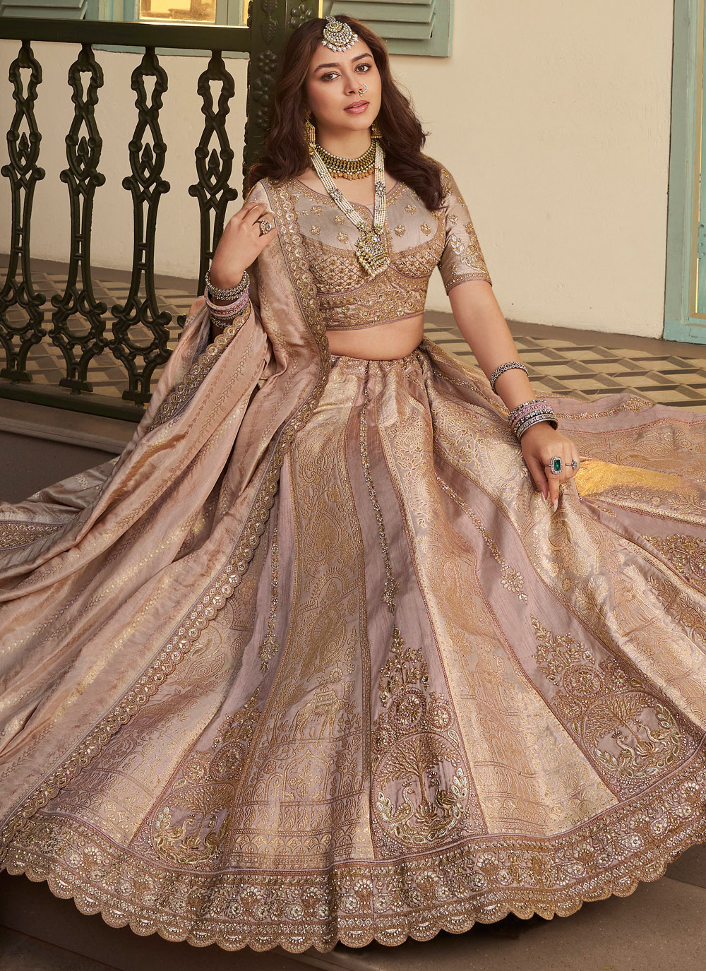 This Pink Banarasi Silk Lehenga Choli is designed to make you shine on your special day. Intricate zari embroidery paired with sequins, Swarovski crystals, and stone detailing creates a stunning bridal look. Ideal for weddings, receptions and royal occasions. Comes with matching choli and dupatta.