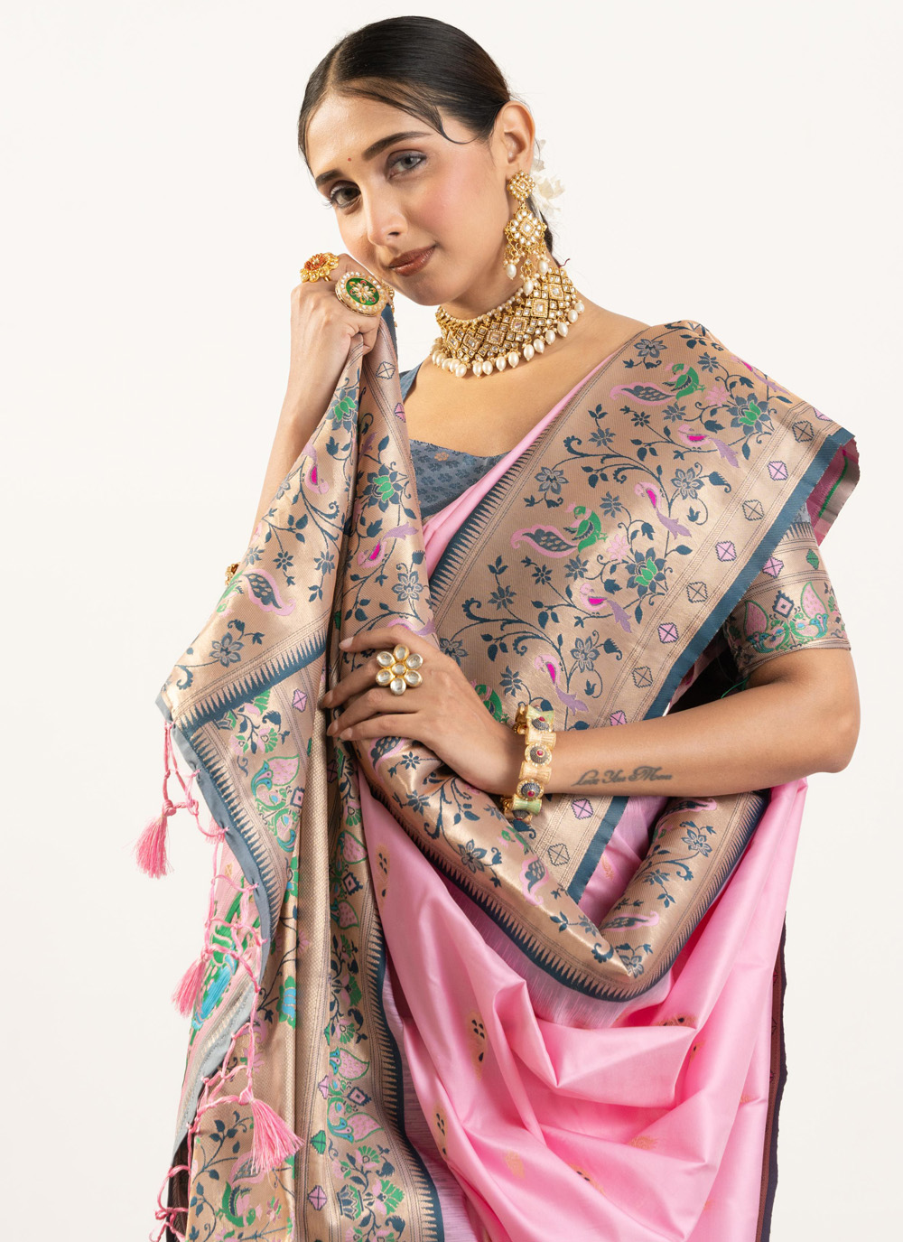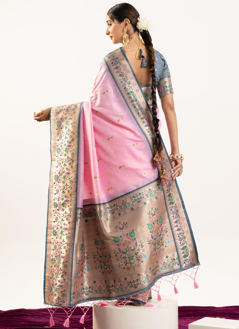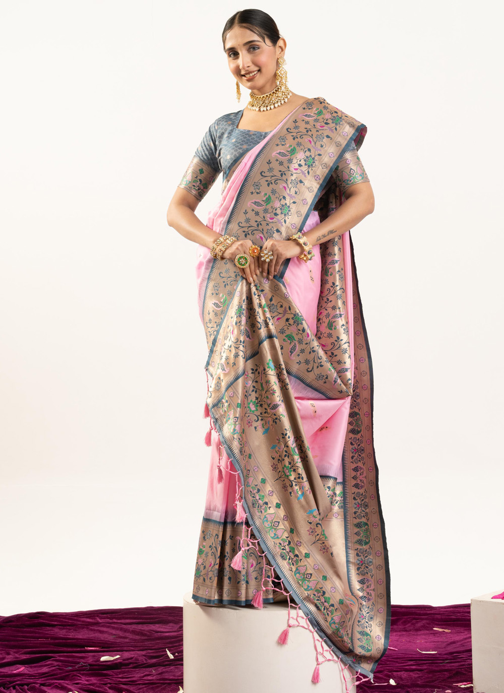 This Pink Banarasi Silk Zari Weaving Trendy Saree is an elegant blend of heritage craftsmanship and modern fashion. Featuring detailed zari woven patterns on premium silk, it offers a graceful drape and a refined finish. Comes with matching blouse.