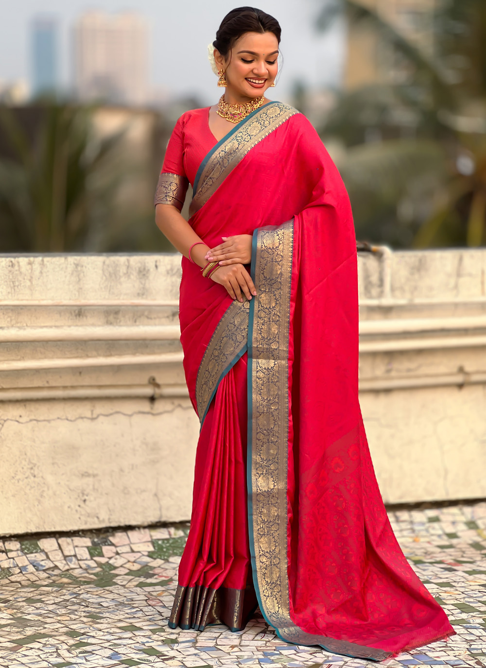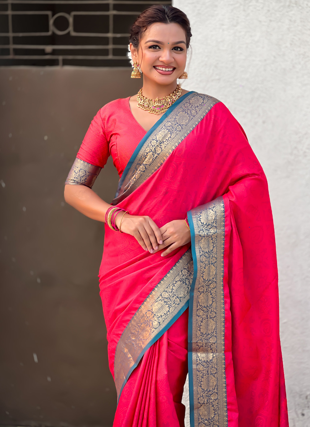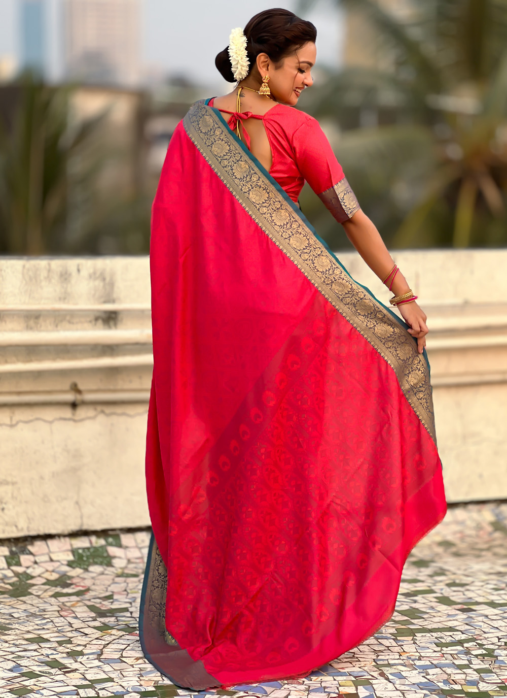A graceful Pink Bandhej Silk Contemporary Saree designed to highlight traditional artistry with a modern aesthetic. The saree features classic Bandhej tie-dye patterns enhanced with elegant zari weaving. Comes with matching blouse.