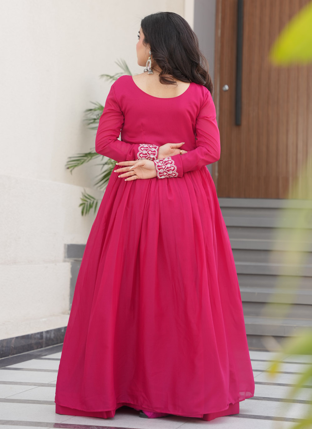 This stylish pink gown features intricate beads work that adds a refined sparkle to its lightweight georgette base. Designed in a flattering cut, it combines comfort and sophistication for weddings, receptions and glamorous evenings.