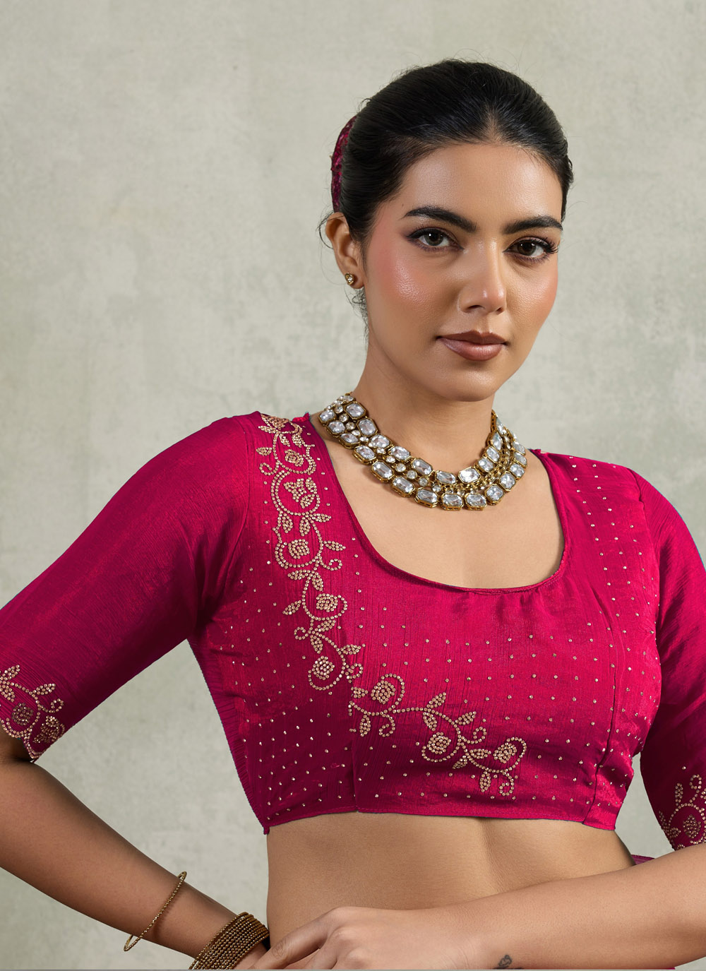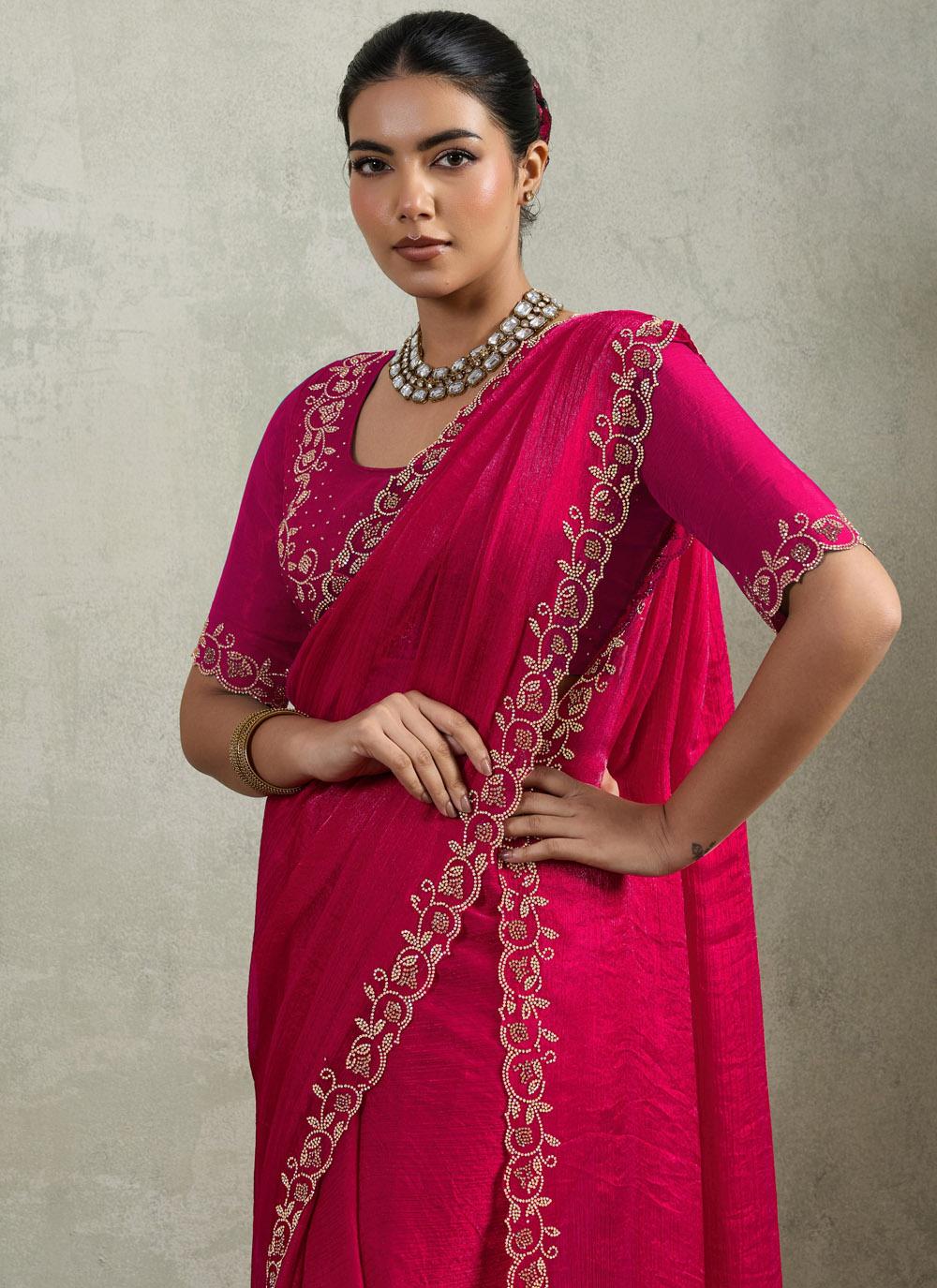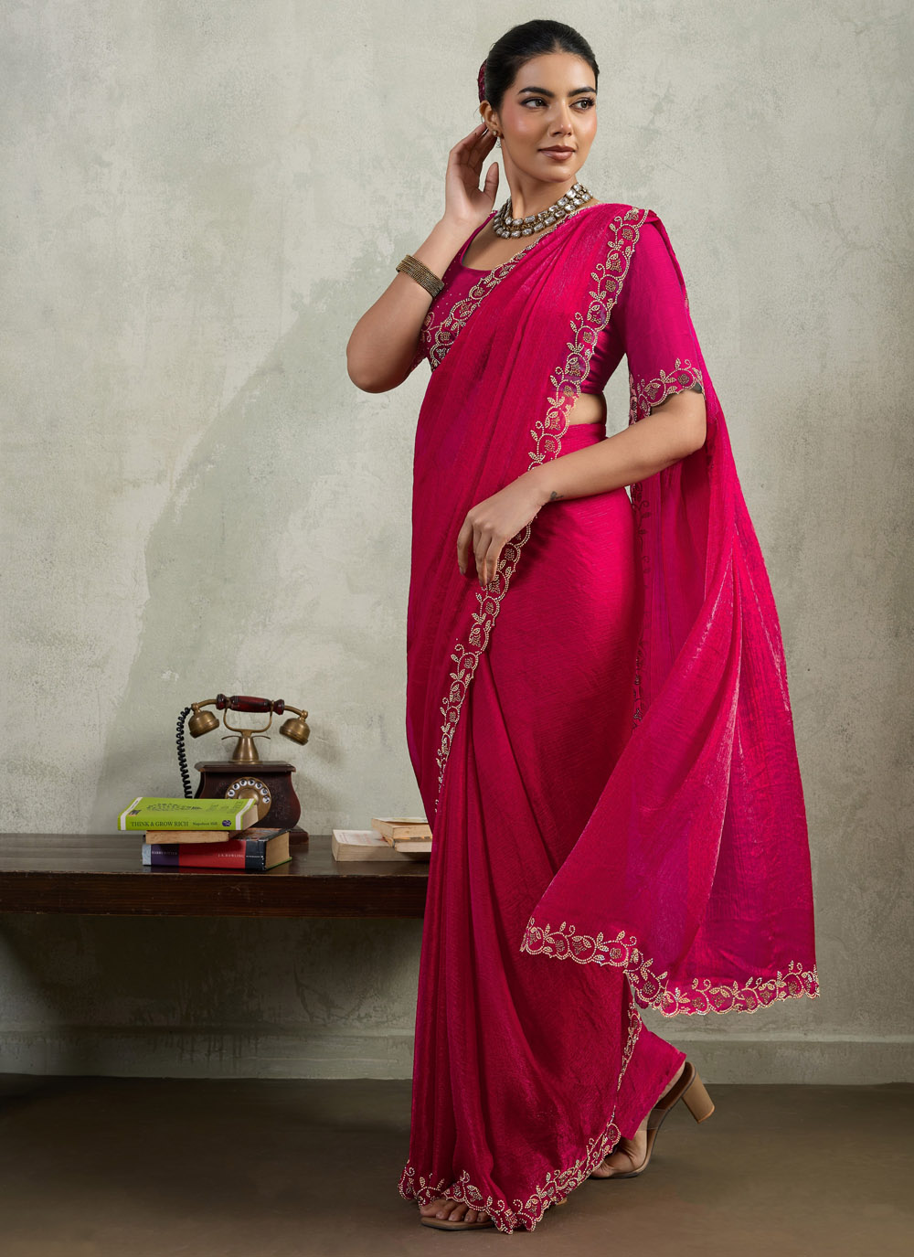 Designed with a blend of modern and traditional artistry, this Pink Saree features velvet chiffon drape, zarkan work and designer cut work detailing, making it an ideal pick for engagements, receptions and ceremonies. Comes with matching blouse.