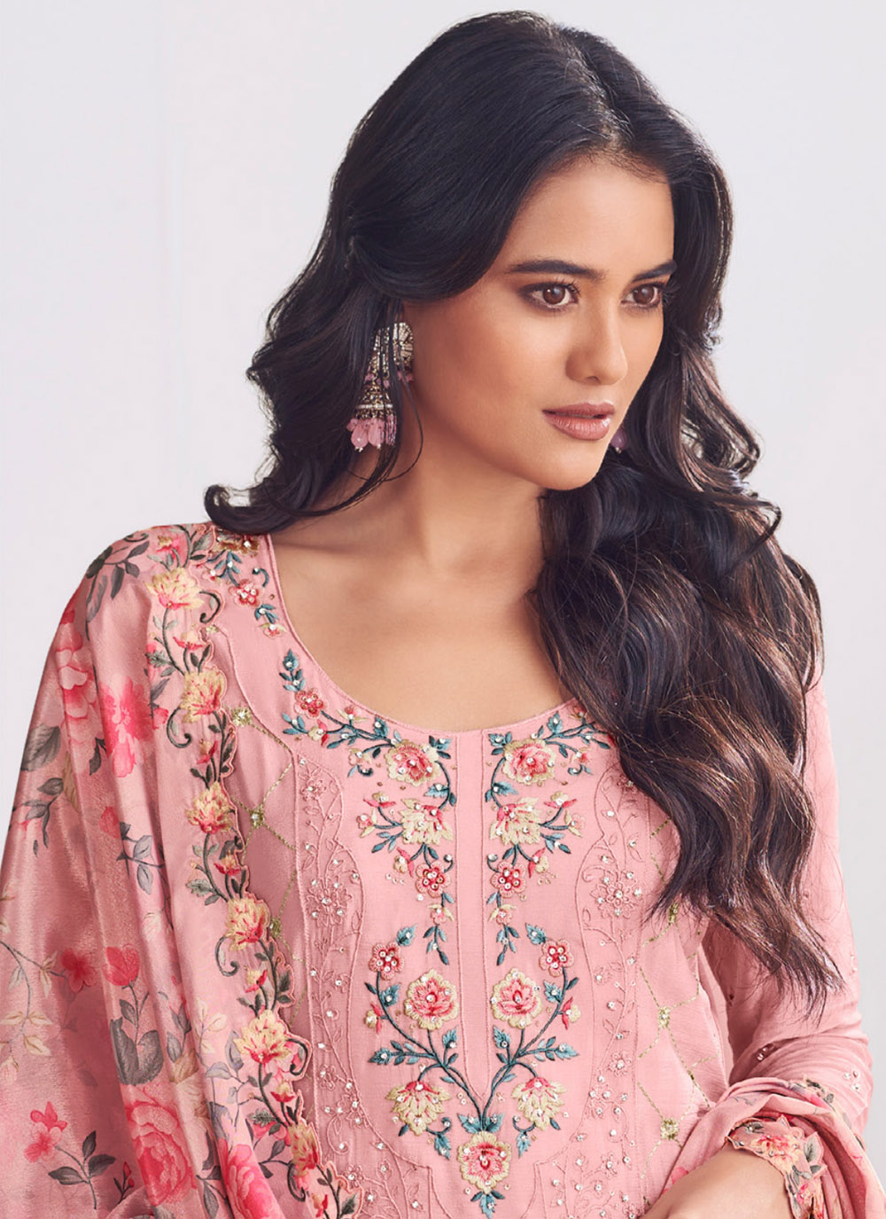 This outfit celebrates traditional craft with a modern twist. The pink chinon kameez comes alive with fine thread embroidery that gives it an elegant texture. Soft, flowy, and comfortable to wear all day, it’s an excellent choice if you want something refined yet easy for ceremonies or festive outings. Comes with matching bottom and dupatta.