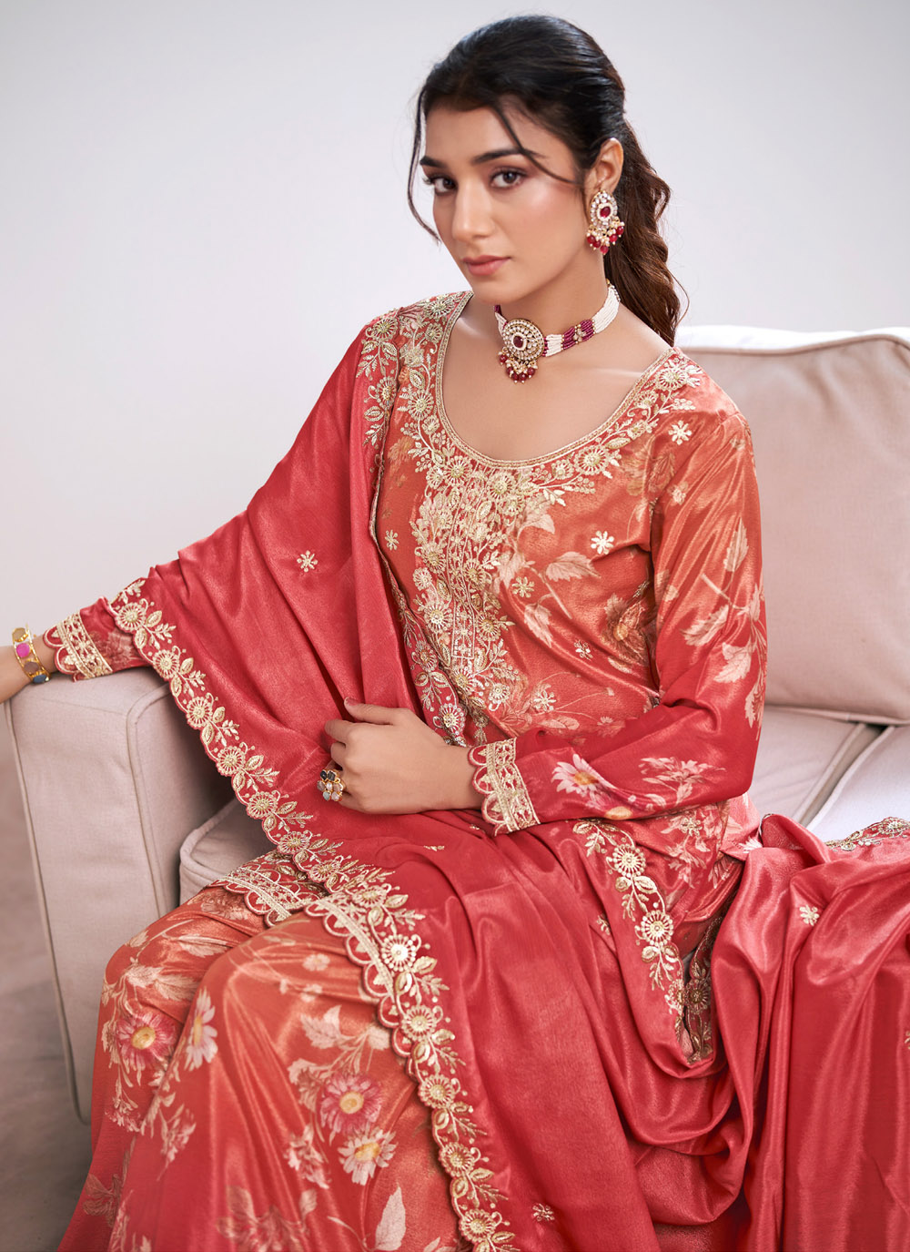 Add a stylish touch to your ethnic wardrobe with this pink Chinon designer palazzo salwar kameez. Printed base with sequins and zari detailing makes it perfect for weddings. Comes with matching bottom and dupatta.